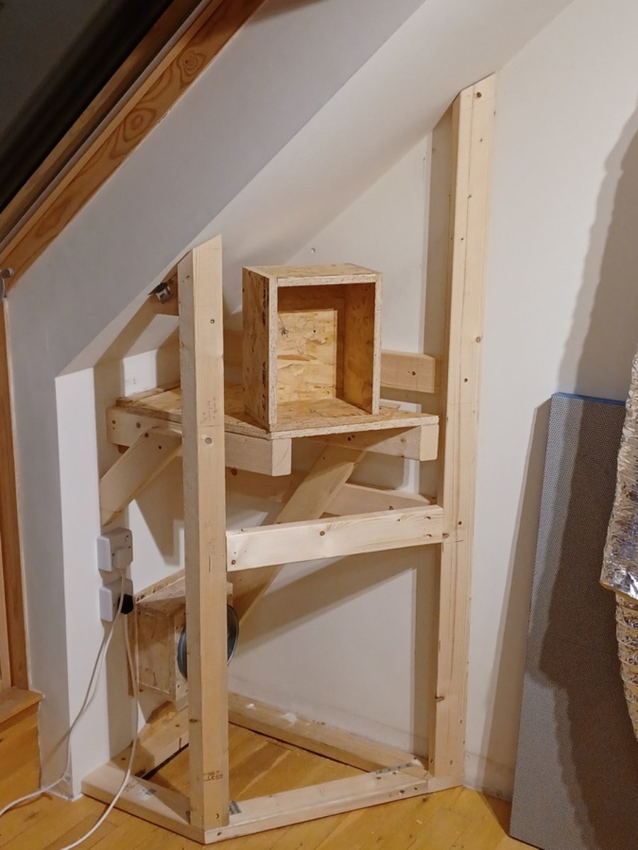 I could feel the shelf & frame the speaker is attached to vibrating at certain frequencies. The knee wall this is fixed to, I couldn't feel vibrating at all. As mentioned before, this wall is very heavy and well damped. There's no direct coupling between those and the isolated soffit baffle structure, and indeed the vibrations didn't seem to pass through into it. This at least is good news