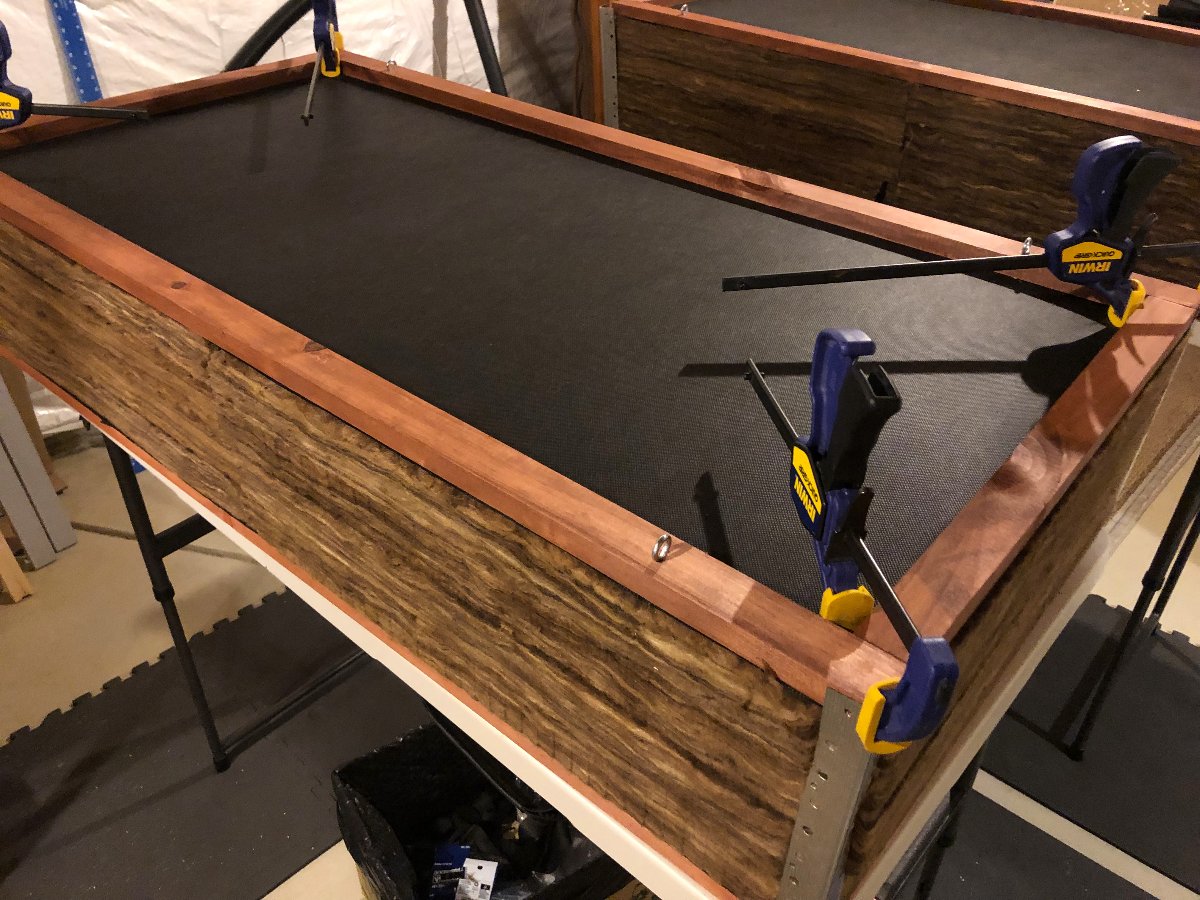 Due to the spread of the fiberglass, it was a bit to get the fabric smooth, even ... but we got it stapled in.