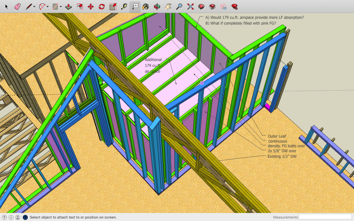 The first 2 images show the original plan for the double wall construction (Inner wall blue, outer wall green). It also shows the mezzanine space above the existing walk in closet. This is where the air exchanger will be. My question is how can I best use some of that space to increase LF absorption.