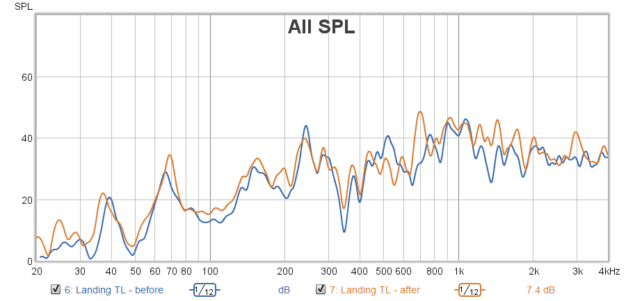 The measurements imply that plugging the holes in the low end and improving overall sound isolation from room 1 to the landing would help this and also reduce sound transmission to the rest of the house in general.