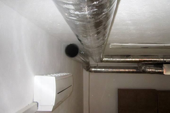 Jennifer, what I did in my last studio was to not use grilles at all. Here (top photo) is the duct delivering fresh air over the top of the AC and the stale air exit duct (second photo) has two entry points without grilles, half hidden behind the cloud. So far my plan is to do the same in my new place. Where Stuart could helpfully advise is whether grilles serve any practical purpose in a studio other than how they look. I think grilles are fitted to plenums, not to the duct, and a plenum usually looks like a box with an inlet for the duct and it holds the grille for the outlet. As the plenum is bigger than the duct, maybe the slowing down of the air speed in the plenum keeps the air noise quieter than my method. I don't know so I am not suggesting you copy me; just be aware that no grille works but it may not be the best method. I need to learn more about this.