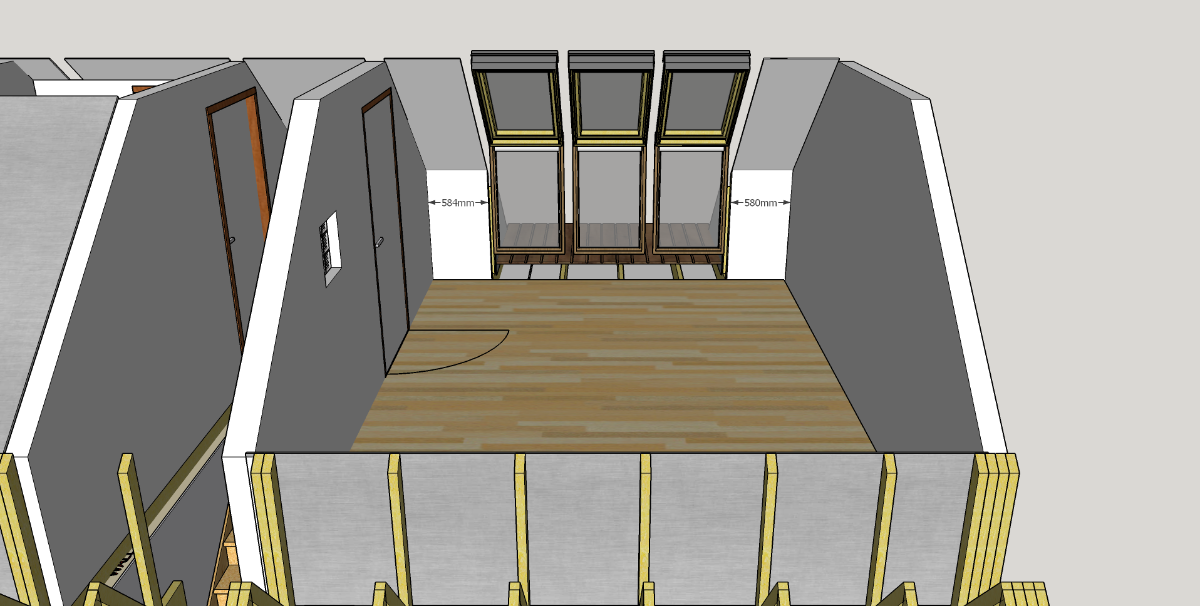 - The short walls from room 1 to the eaves are 12.5mm plasterboard, but presumably the large cavity (now with more insulation) between that and the equivalent short walls on the landing and other rooms helps with sound attenuation.