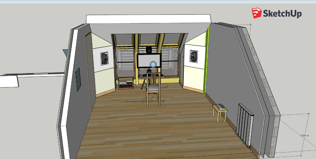 It also brings me to a wrinkle in the design mentioned earlier in the thread that demonstrates the truth of Avare's signature: "Good studio building is 90% design and 10% construction". Note that currently the short walls and corresponding slopes at the front of the room are different widths, left is 625mm, right is 580mm;