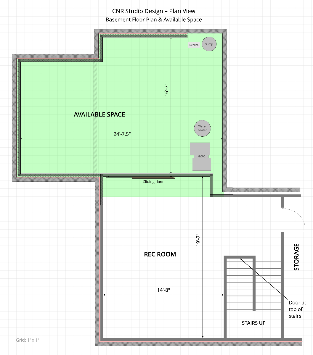 I want to start working with other musicians again soon, but that isn’t a significant concern for the studio design. The design that will meet my solo goals will be fine for two or three of us. I plan to have strong enough ventilation to keep the room comfortable for multiple people, and there’s a bathroom right at the top of the basement stairs. I will use it only as a personal/private studio (no commercial use).