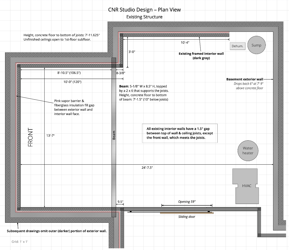 The interior room dimensions of the planned studio are 16’-3” x 12’-3” x 7’-7.5”. Because the existing walls are slightly out of square, I’ve used the front edge of the beam as the reference for laying out the new walls (light brown frames) and everything else.