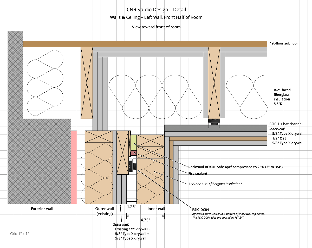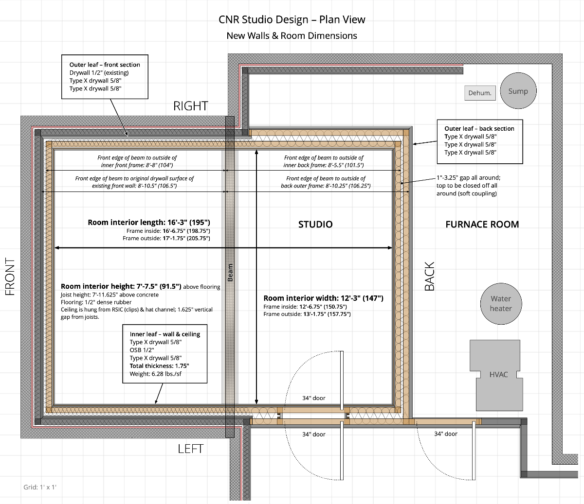 You’ll notice that in the front half of the room, the plan places the outer leaf on the inside of the outer wall (the outer of part my double-stud wall), making the space between the inner leaf and outer leaf narrower than in a normal double-stud wall. Also in the front half of the room, the double-stud wall runs along and in close proximity to the exterior wall of the basement.