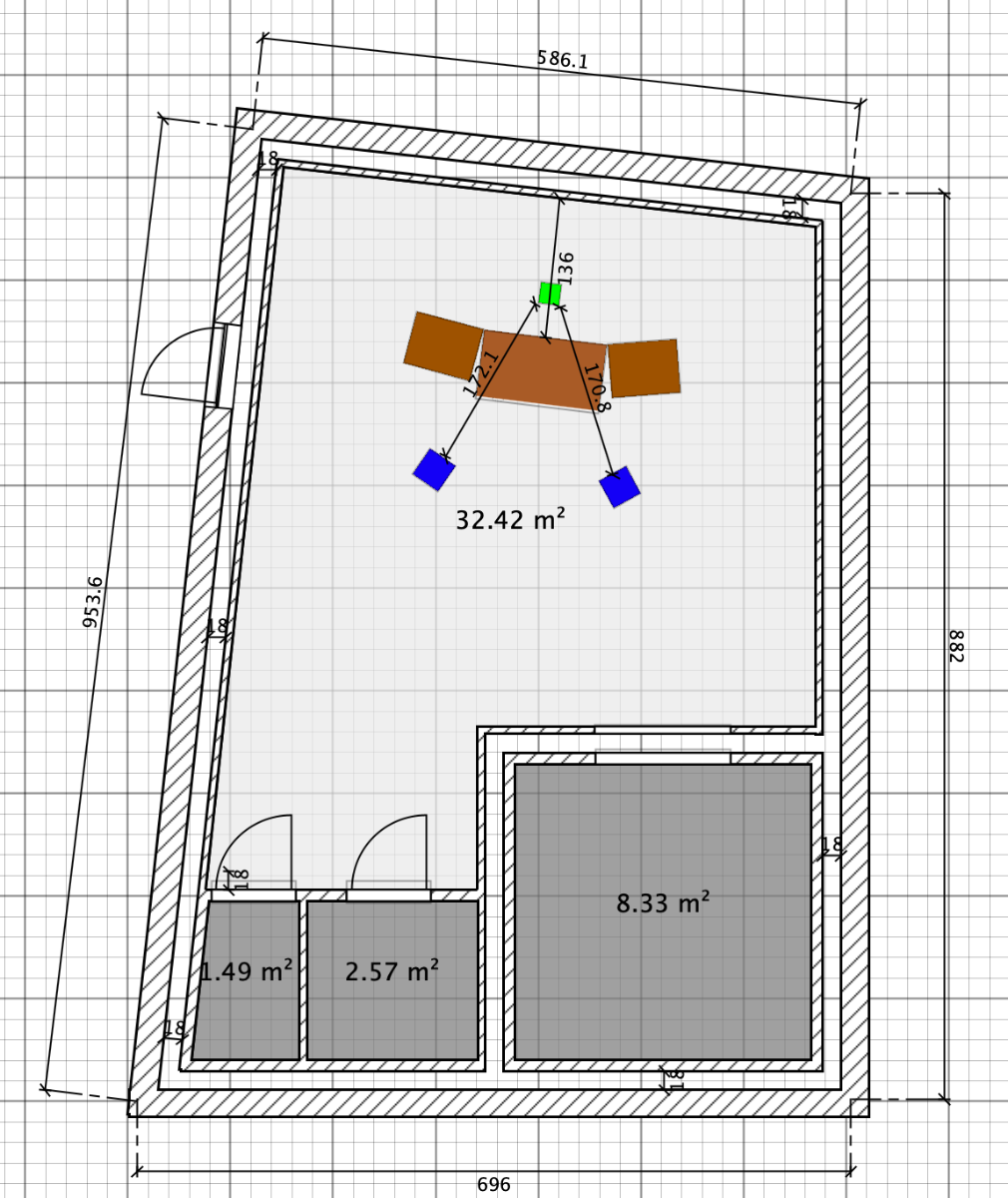 At first I really wanted to create a layout that includes a control room, live room and iso booth. Also because it just look cool as hell. But I later realised that this would compromise the control room too much - while I expect to spend the vast majority of time in that control room. So, I am now pretty set on it becoming a single room studio with a separate iso booth (large enough to also record drums).