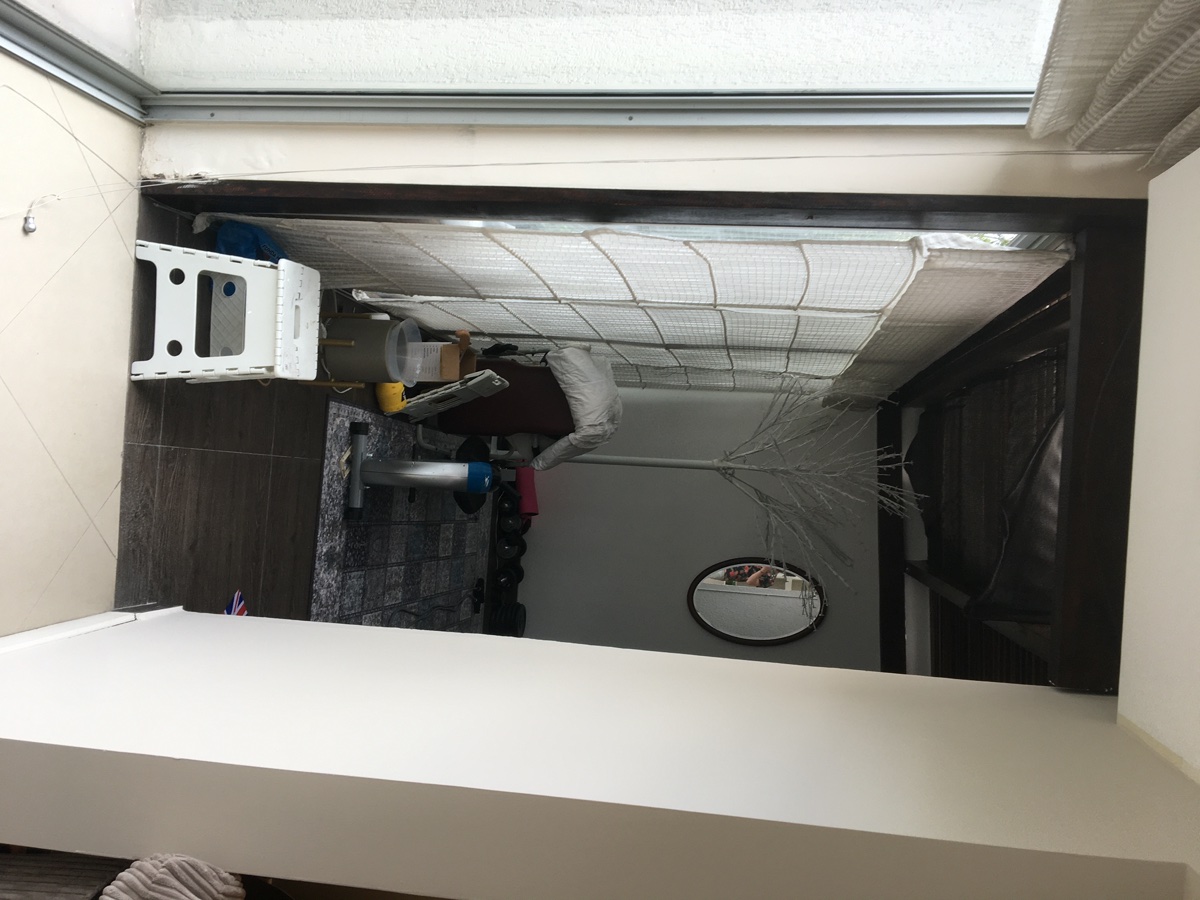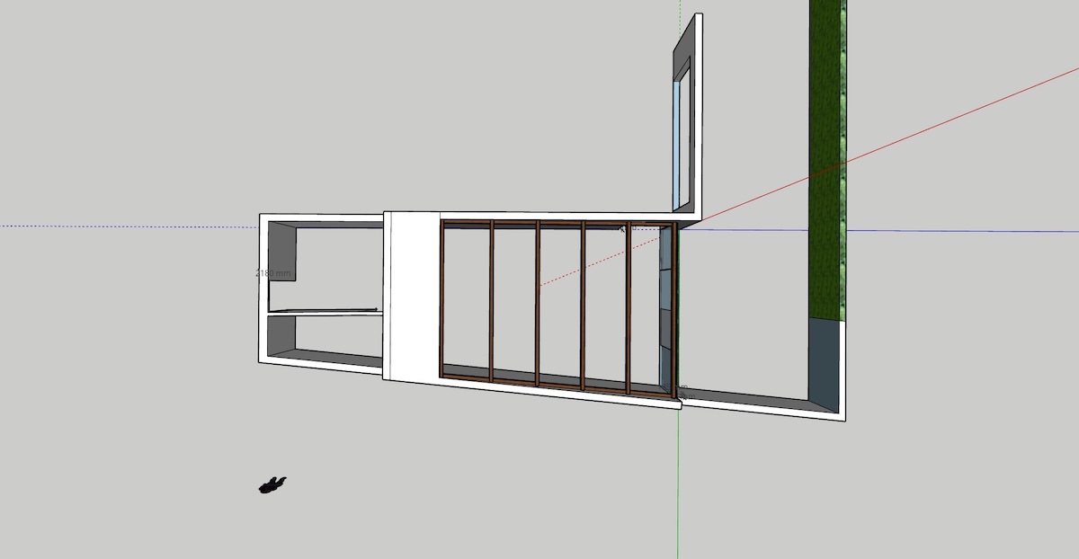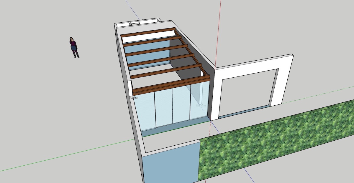 1) The space used to be part of the garden. It sits between what used to be the external wall of our house, and the perimeter wall of our garden (the two long walls). The other side of the external house wall is our living room, and the other side of the perimeter wall is the neighbours driveway. The two other walls are the shorter walls, one of which is part of our house, the other side being another room of the house. The final wall is actually a set if sliding glass windows, leading onto the garden (this is far more clear in the sketch diagrams below!)