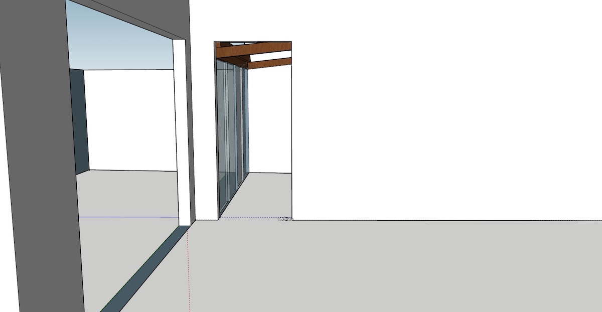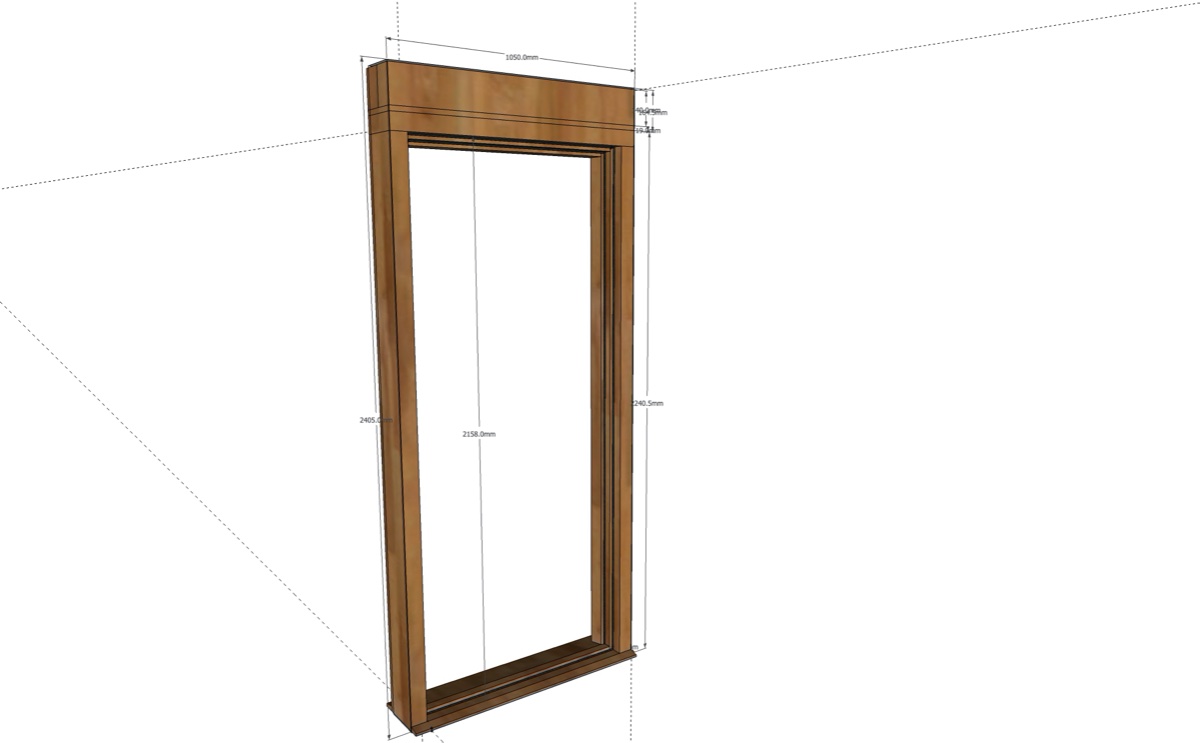 Unlike a lot of the designs and examples I've seen online, where the opening for the door is planned at a specific size, I am dealing with an already-existing opening, with its own dimensions (again a SketchUp of this is below). This means that, given the width of the door is also set in stone by the supplier to a maximum of 910mm, I am unsure of how to fill in the gaps either side, and above, the door.