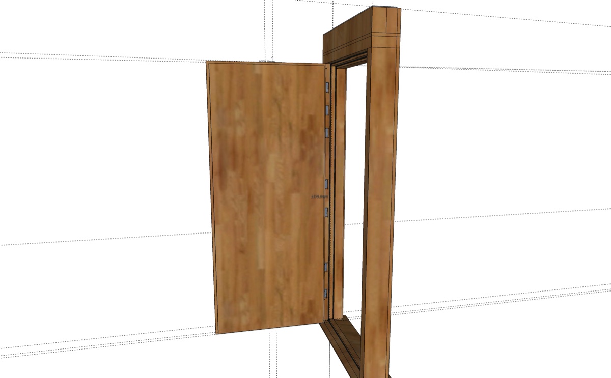 The thickness of the wall that frames the opening is approximately 158mm (6 inches). I therefore plan on using 5/4 stock lumber for the jambs (140mm). I do not intend on using a thru-jamb connecting the two leaves, purely due to the thickness of the wall which creates the outer leaf. I will basically have a space between the outer leaf and the inner leaf, covered up with some form of fabric to hide the innards. The 5/4 will be the frame of the whole door (please advise if you disagree!)