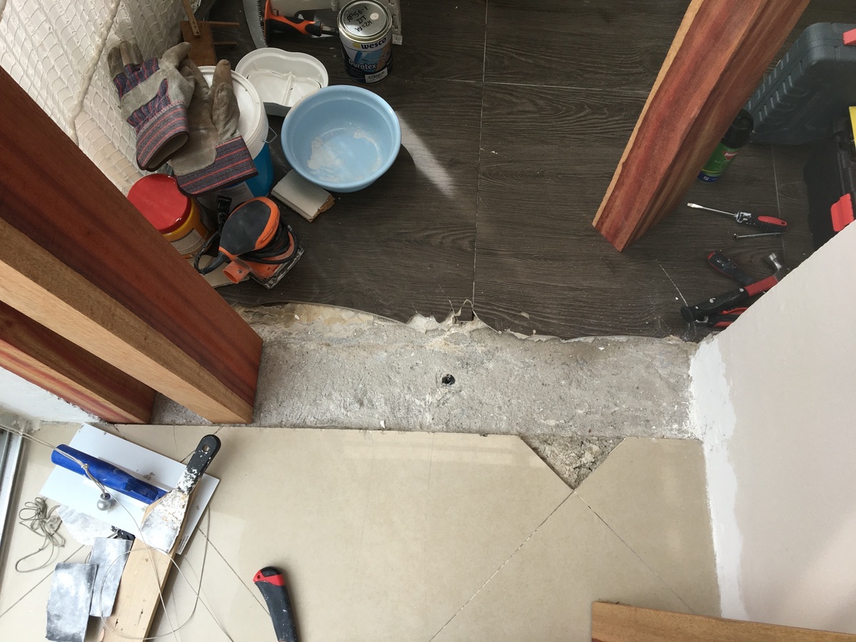 I've also removed the porcelain tiles from the section of the floor where the door will go. It looks a mess, but ultimately I'll be replacing the entire floor of the studio, so I'm not worried about the damaged tiles (the dark ones are the studio ones). I'm going to fill the small gap with concrete today matching the width of the door frame, up to the level of the floor in the living room, to mount the threshold onto at a later date. The threshold will overhang on both sides, so the transition will be smooth for now despite the mess.