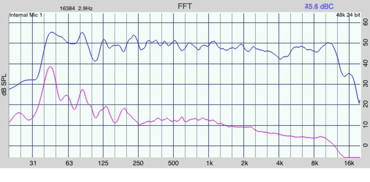 Pink noise playing in the room (blue) and the result just outside the door (purple).