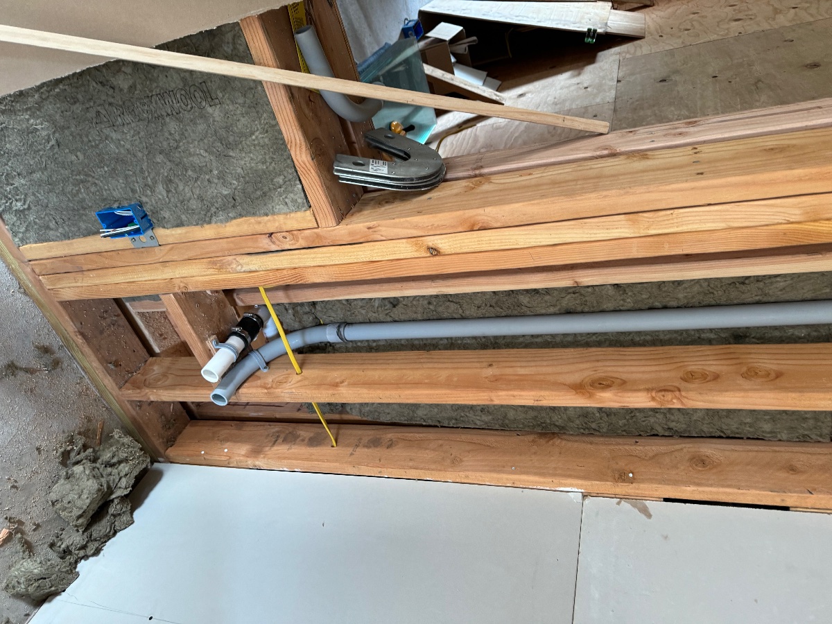 First I ran the conduit for running all the cabling between the rooms. It took a lot of trial and error with fitment and parts but I’m happy with the outcome. For the shorter run I used regular pvc with a few 90° turns for good measure and decoupled it by cutting the pipe and using a rubber sleeve I found at Home Depot to connect the 2 ends. The other pipe goes up into the attic and I’ll drop cables in from there.