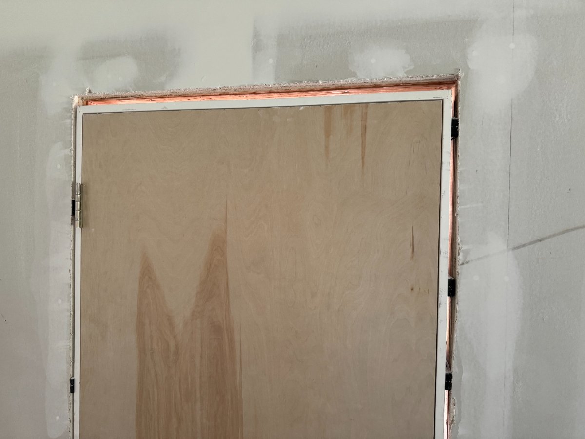 Of all the work done so far, I am most proud of these windows. I used Stuarts built on site method. The outside glass is 3/8” laminated set with glazing tape and caulked with PVC trim cleating it into place. The interior is 5/8” glass set on a neoprene seal and cleated in place with some interior trim ( interior glass not shown in this photo.) I stuffed the 1” gap between the frames with rockwool, then I found these great 1/2” polyester felt boards and covered it all up. The felt cut amazingly on a table saw and its rigid, but not so rigid that it creates a flanking path but has a nice friction fit. I also used a brad nailer to tack it for good measure. It looks super cool too.