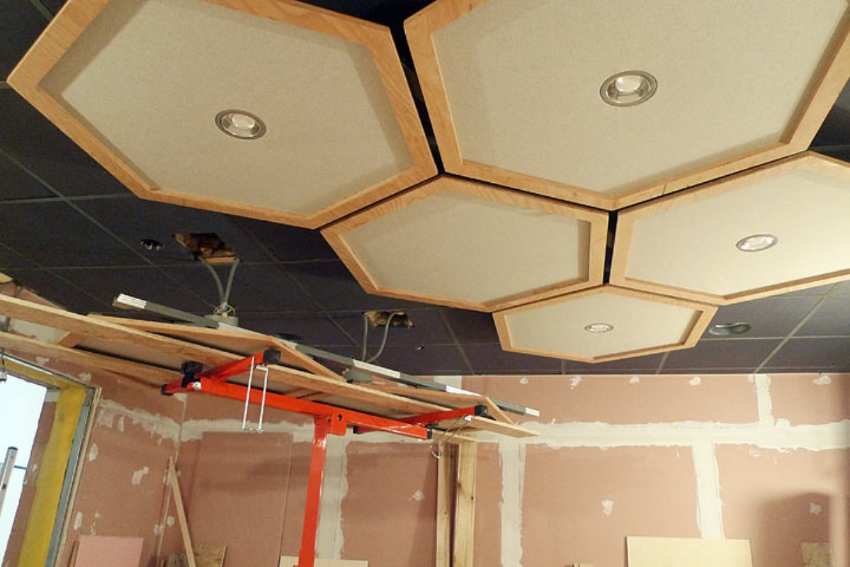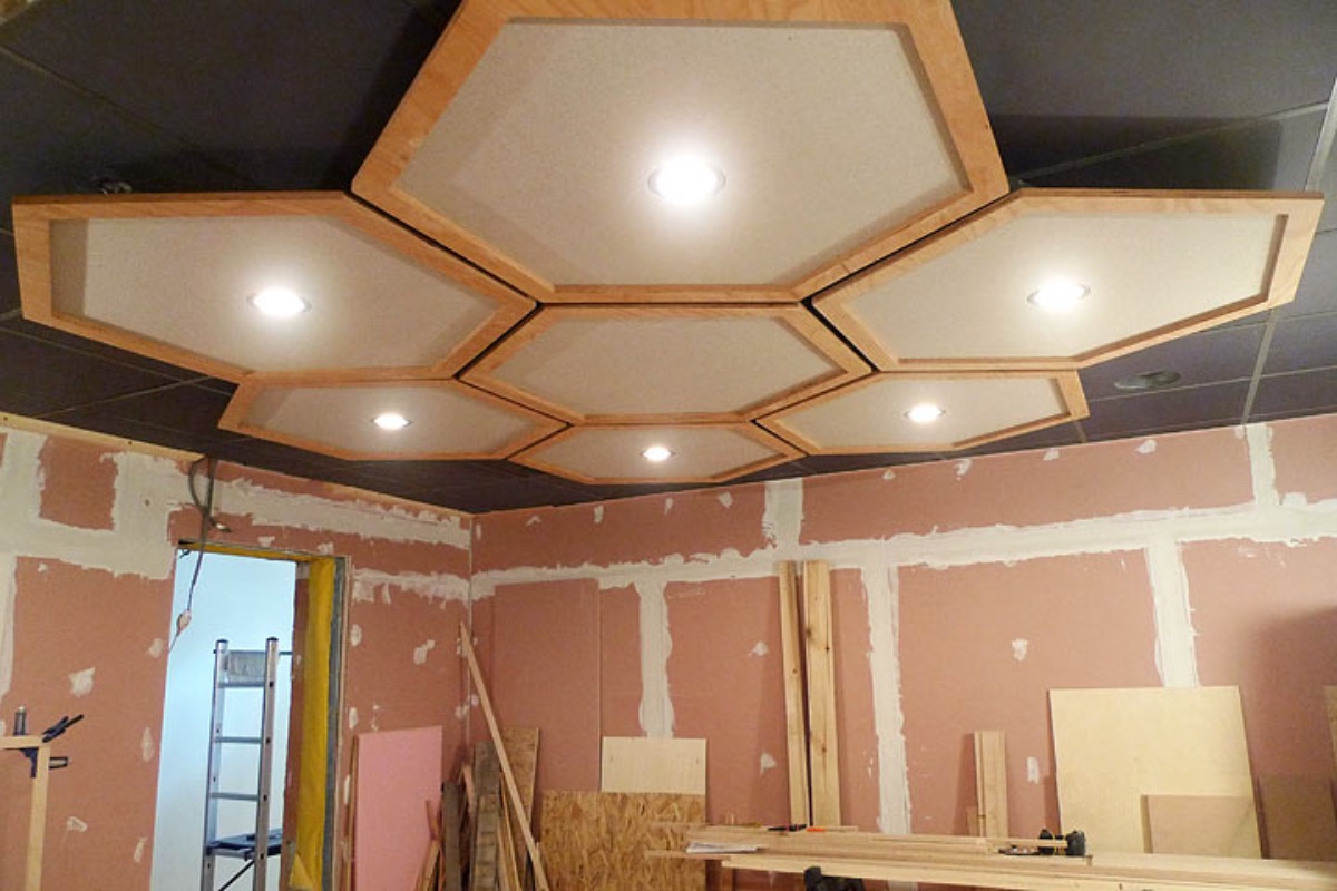 The hexagons are something I wanted to do as I don't feel so creative sitting under an office drop ceiling. These were not part of my studio designer's plan, I got inspired by this Wes Lachot design.