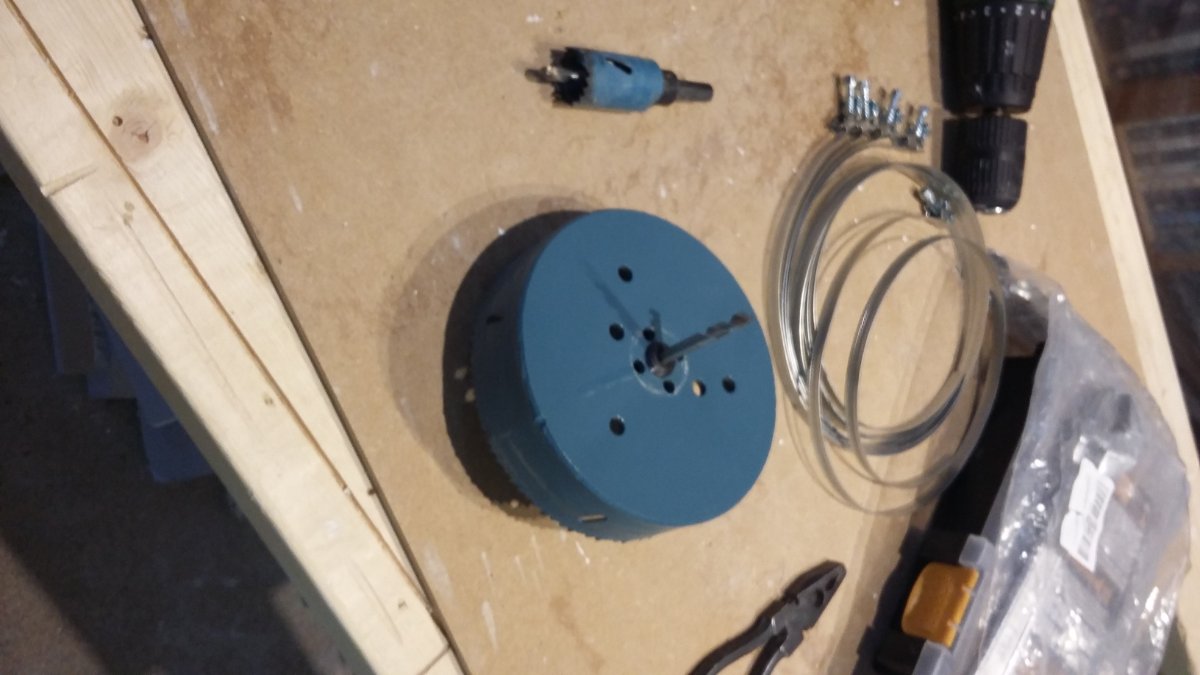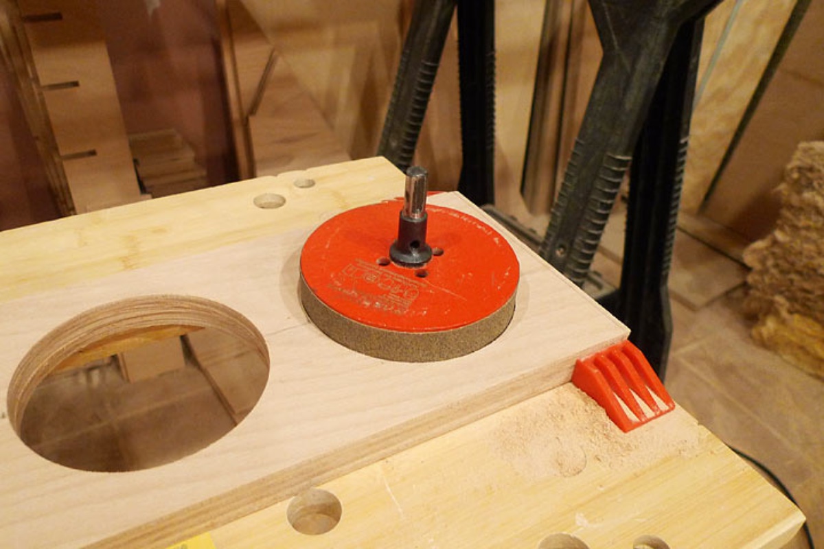 I drilled the holes with this 100mm hole saw. Now I need to sand the inside of each hole to make the wood smooth before I oil it. I wonder whether sticking sandpaper to the edge of the hole saw would work but the teeth flare out from the body so I am not sure - but I haven't tried it yet. Does anyone have a better (quicker) suggestion than sanding so many holes by hand? They will be visible in the finished studio.