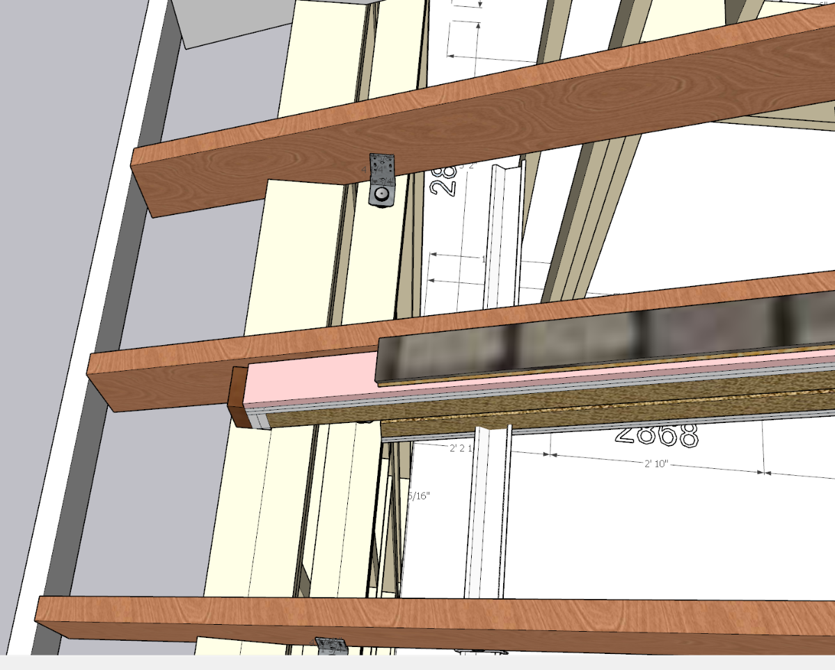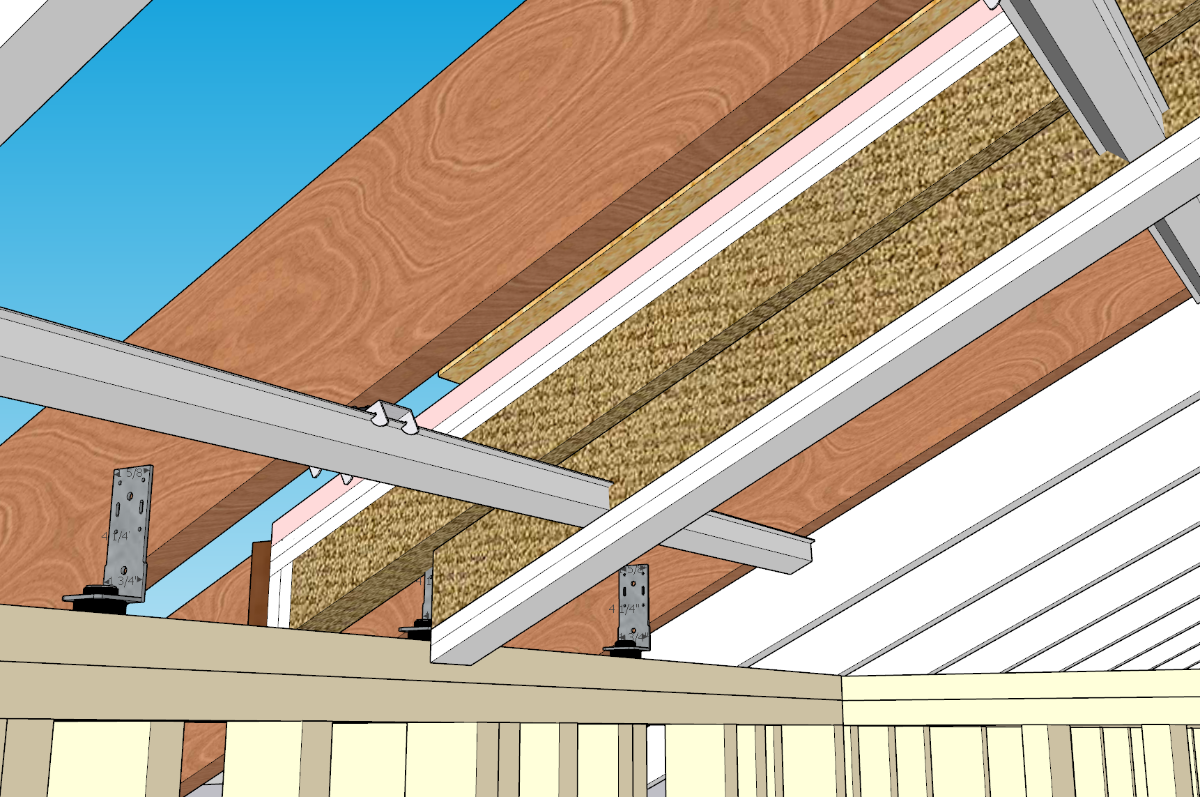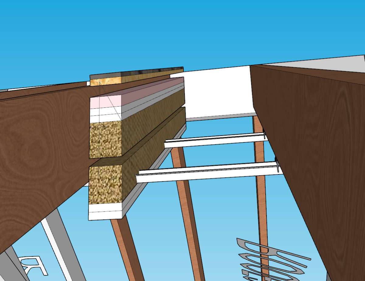 Thanks to a little help from Glenn for helping me with preventing a 3 leaf system, I have decided not to use a rafter system for my inner leaf. Now that the collar ties have lowered the ceiling height, I am going to reclaim it by using isoclips instead. Note that I have not updated the sketchup but I wont use those decoupling brackets to the rafters, I will use isomax clips that will time them to the exterior walls instead.