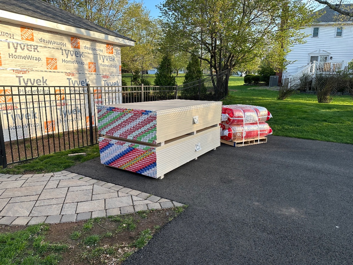 First load of drywall has arrived for the outer leaf. I’ve also learned that my 10 gallons of green glue is out for delivery today! A good day.