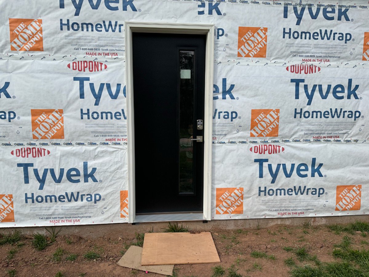 Never sent this update, but we now have a roof, sheathing, and tyvek! It's officially weather resistant. I ordered a door but it takes several weeks.