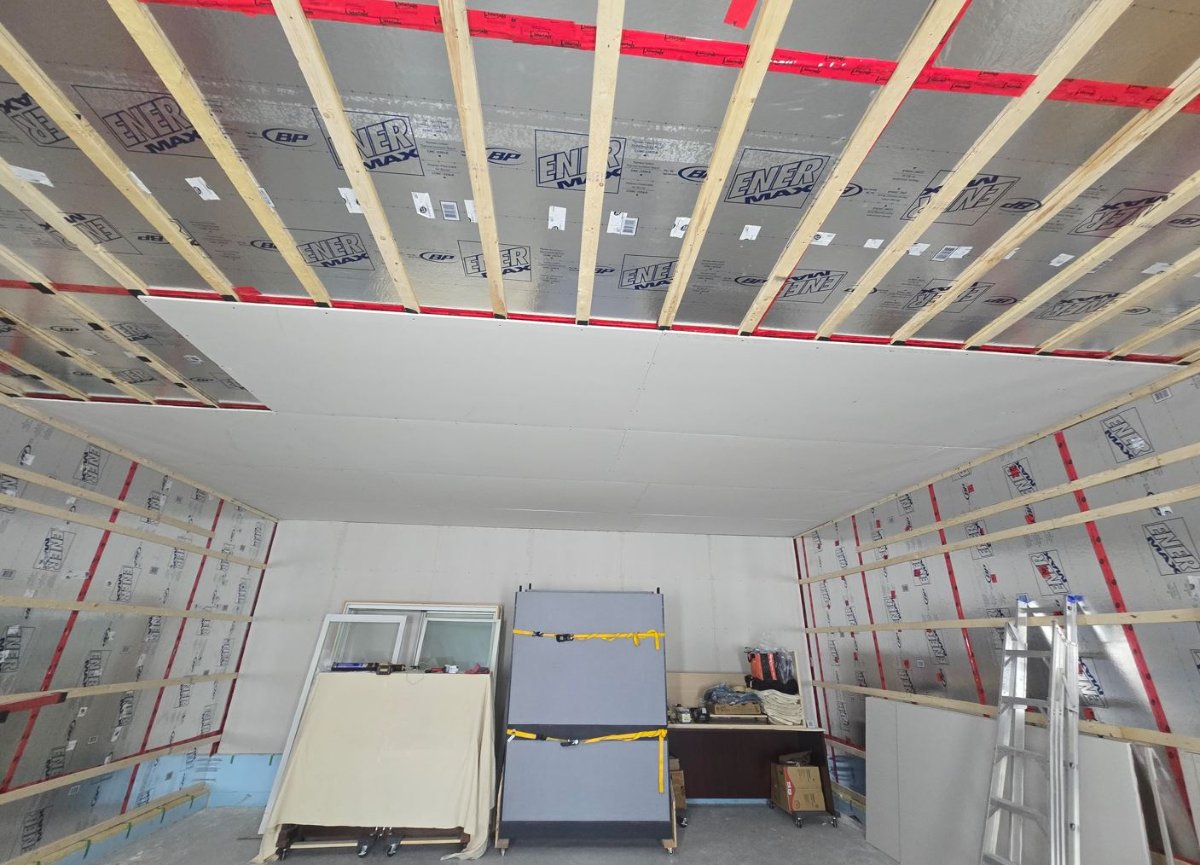 After that, we put the second layer of drywall on ceiling and walls by overlapping the joints (I would have preferred to stagger the sheets a little more but it's probably better than not overlapping at all). Then backer rod and caulk after each.