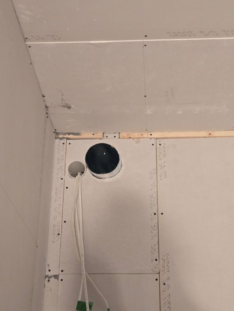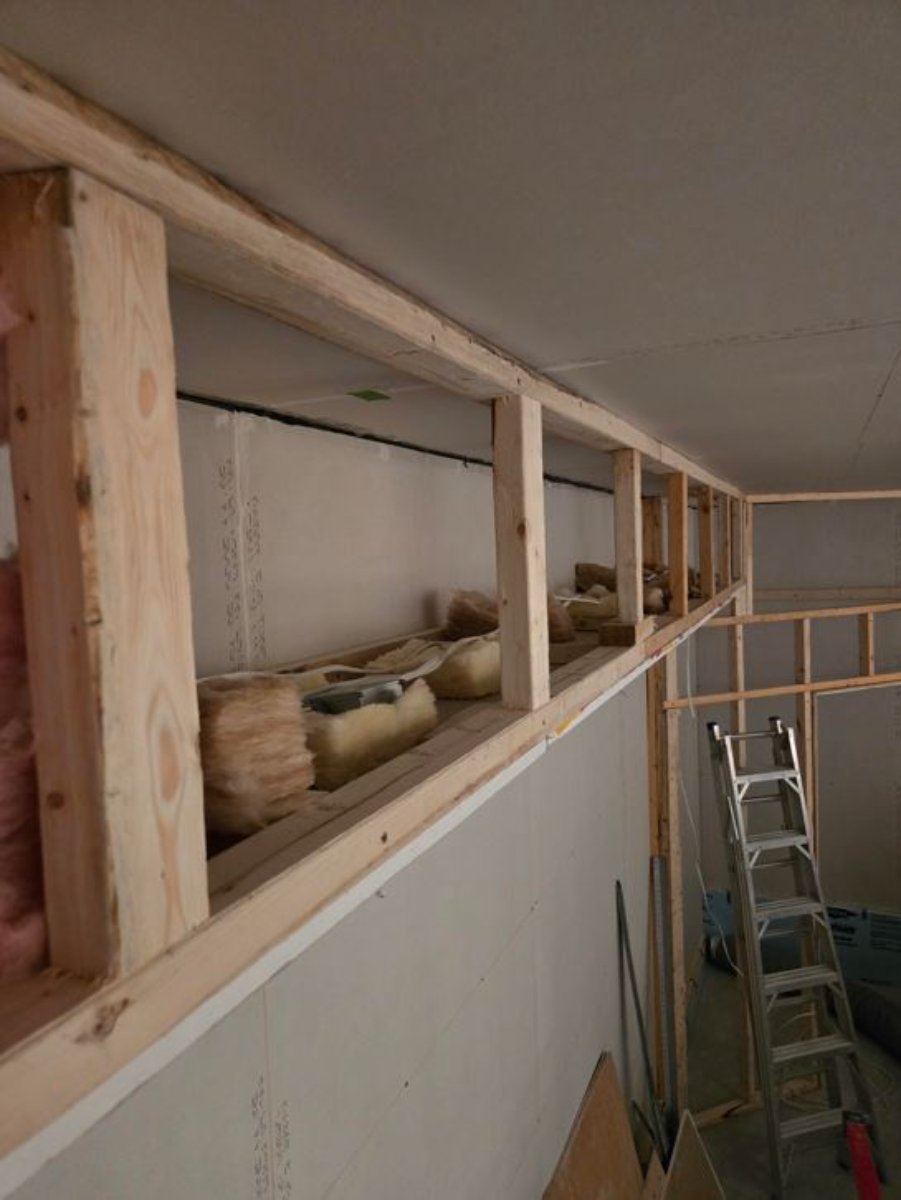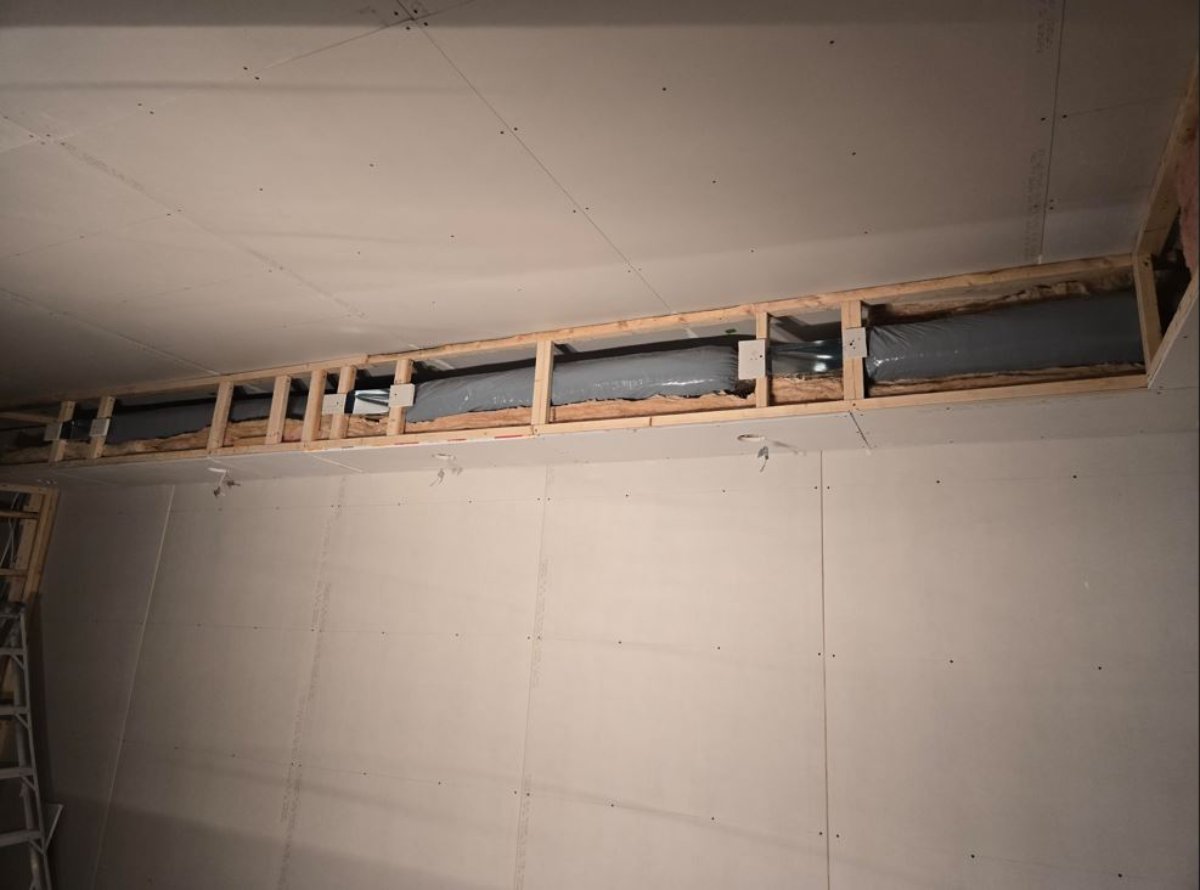 For the second layer, we laid the sheets horizontally to simplify covering the seams. We still need to finish the sections around the pipes. We started framing the box above the doors so we can install the indoor unit. The contractor came to install it yesterday. I will cover it completely for the duration of the work to prevent dust from entering the unit.