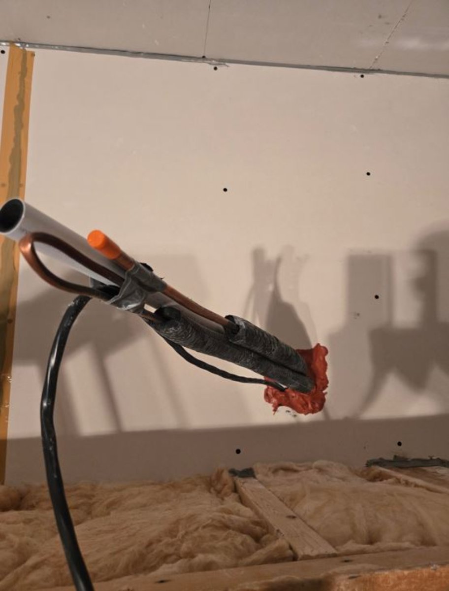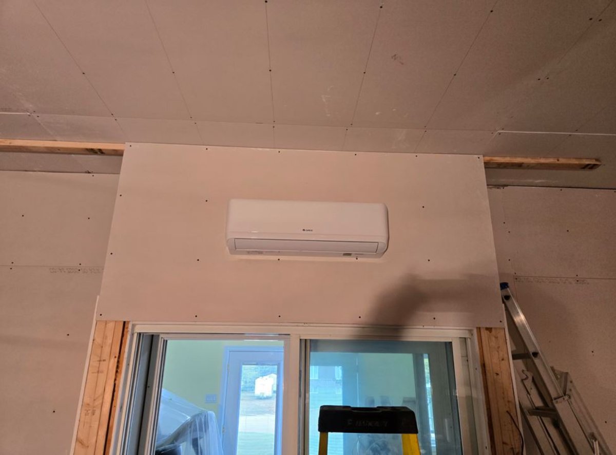The contractor then came to install the piping and the outdoor unit. He will return to install the indoor unit when the wall above the sliding doors is done.