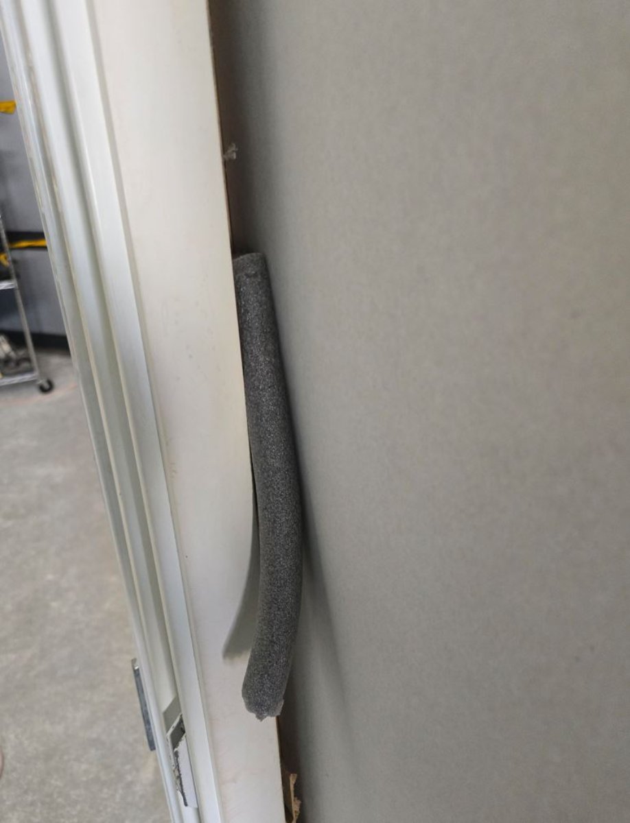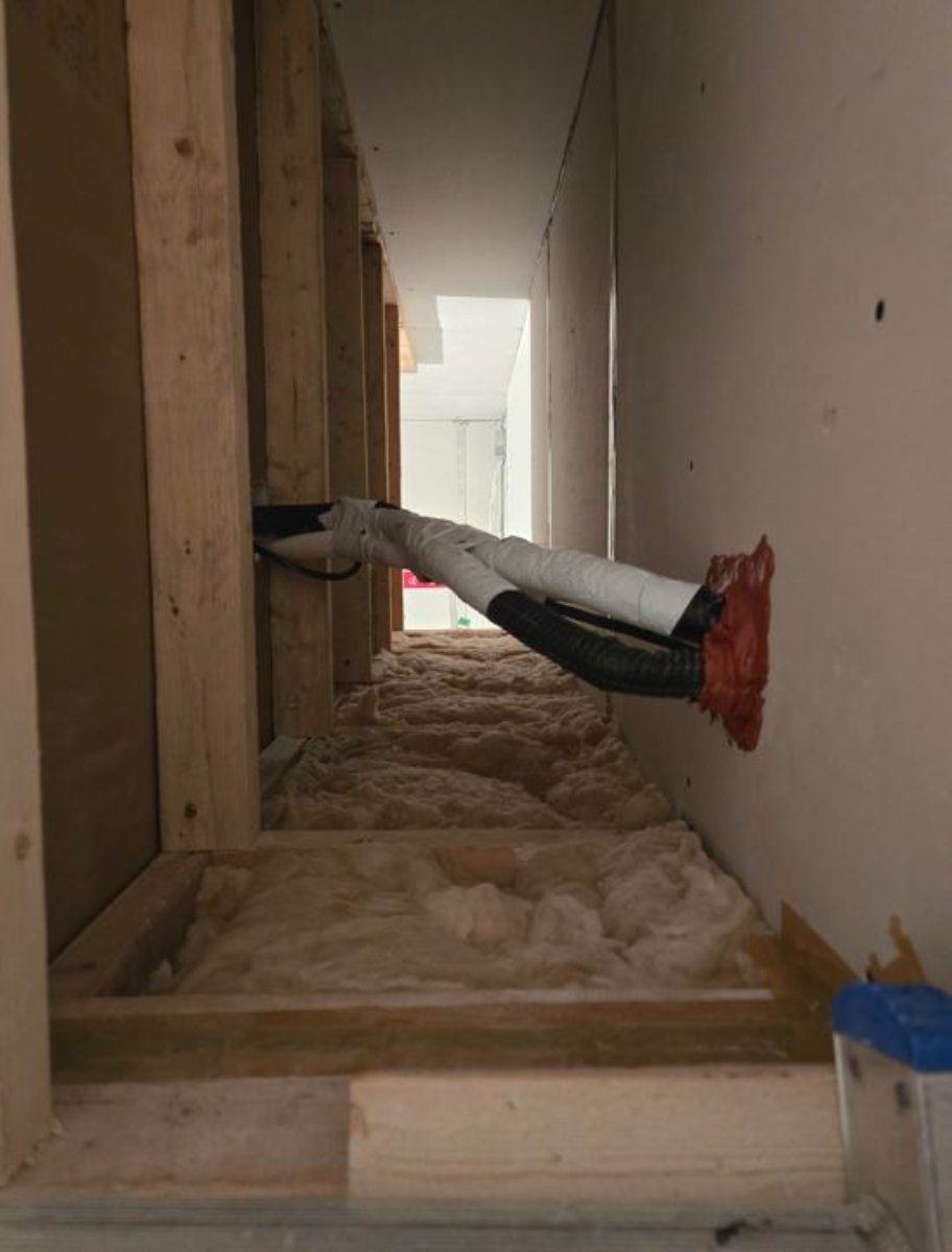 After thoroughly protecting the indoor unit, we finished applying the second layer of drywall in the corners (around the ductwork, not yet sealed). I installed backer rods and applied sealant to seal the door frame on the studio side, and then we finished by applying the 5/8" drywall.
