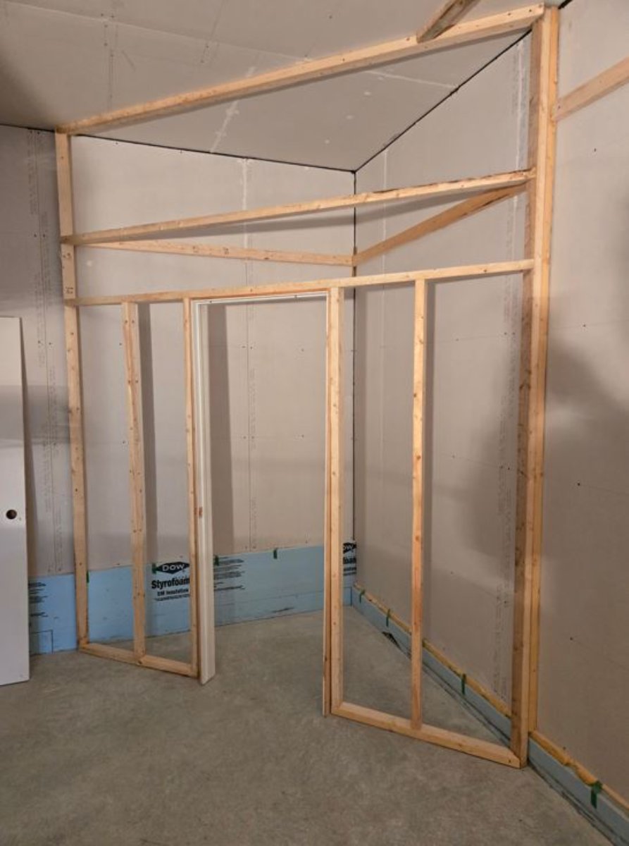 I put wool between the top plate and the ceiling (1). Then we installed slats (to form a 90-degree angle) to have a hard base so we could screw the drywall into this corner (2). I also put wool in the corner of the second wall (3). Then I put the drywall the corner.