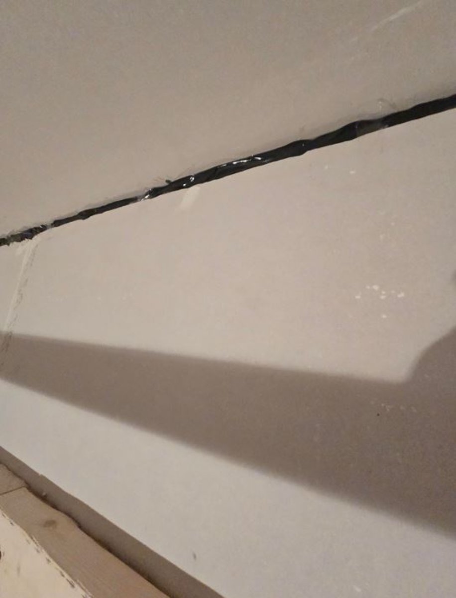 We screwed the first layer of drywall onto the walls except the dividing wall because there are still wires to run. Then backer rods and seal.