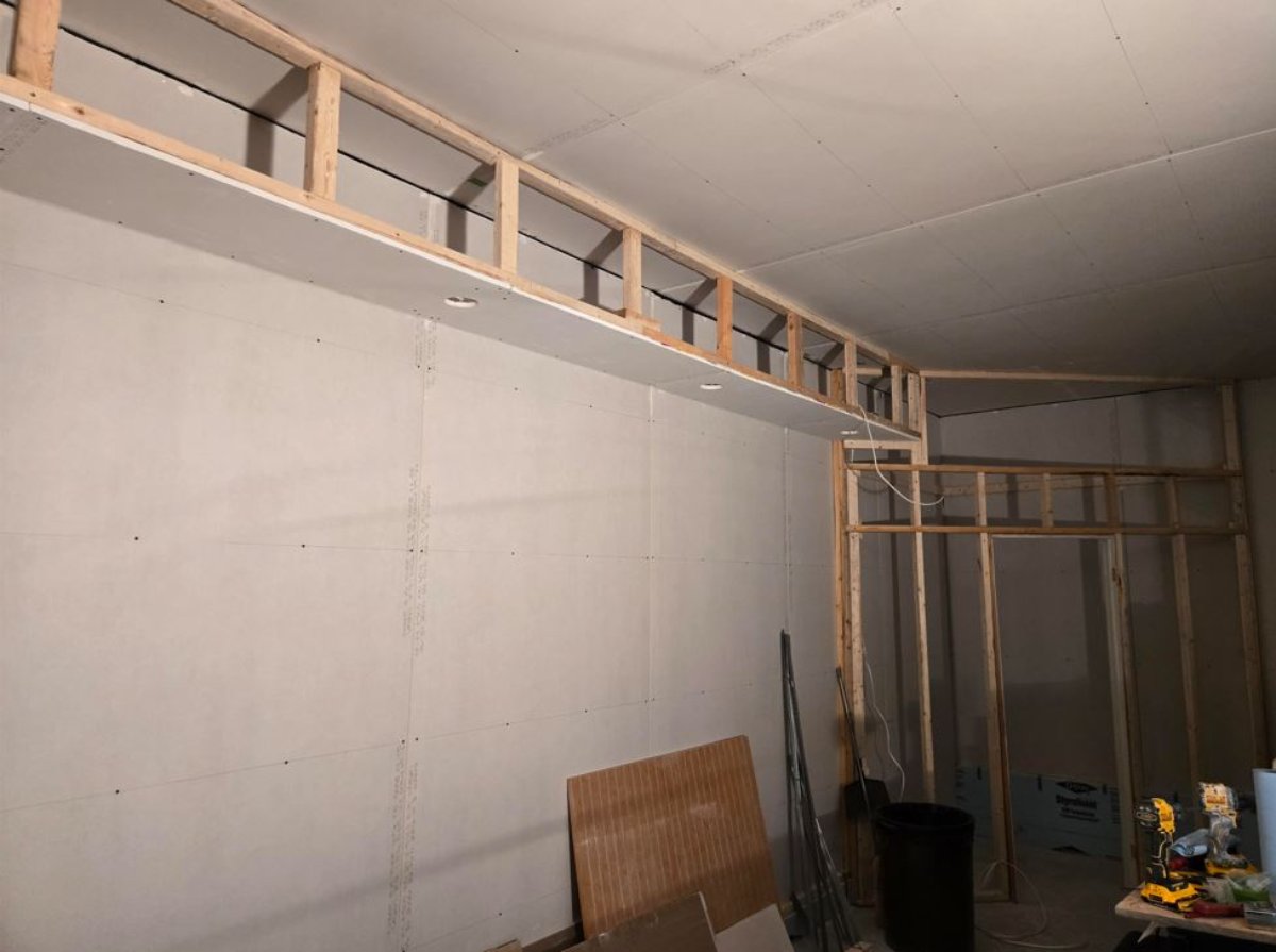 Then we installed drywall underneath the soffits, drilled holes for the recessed lights, and installed only the junction boxes with integrated drivers. However, we temporarily plugged in all the recessed lights to make sure they worked properly.
