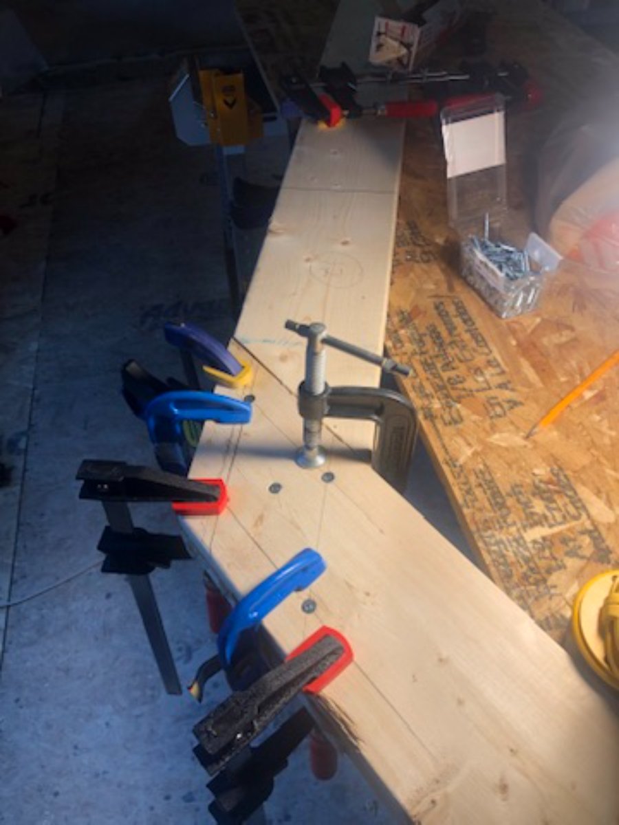 I needed 2 heavier style trusses for the back wall and I wanted to make them the same thickness as the 2x4 side walls. Had to make them 3.5" thich so all I did was cut 1/2" OSB and glue it in between 2 trusses, with clamps, glued and fasten. You'll see later in the build where these trusses go ;)