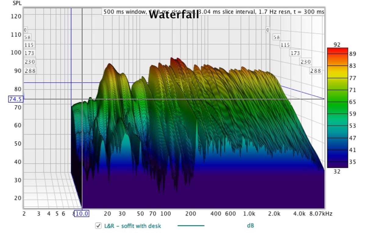 I'm wondering if what I'm hearing could be related to reflections off my cupboard doors? The AMRAY trace below suggests I could currently be getting sound bouncing off the back then off the cupboard doors, but I defo hear a harsh sound. I tried adding an EQ to music playing, turning down 10KHz and above and that helped. All together a disappointing evening. I need help!!
