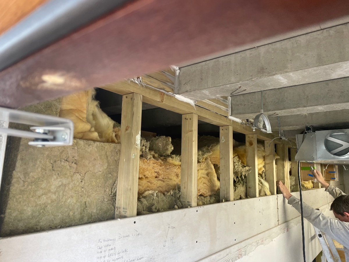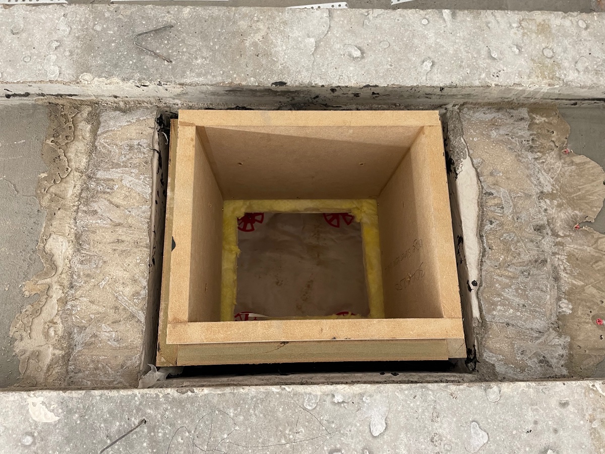 Before insulating we shuttered around the silencer sleeves into the studio and poured concrete vibrating it using an sds drill on hammer… well consolidated concrete!