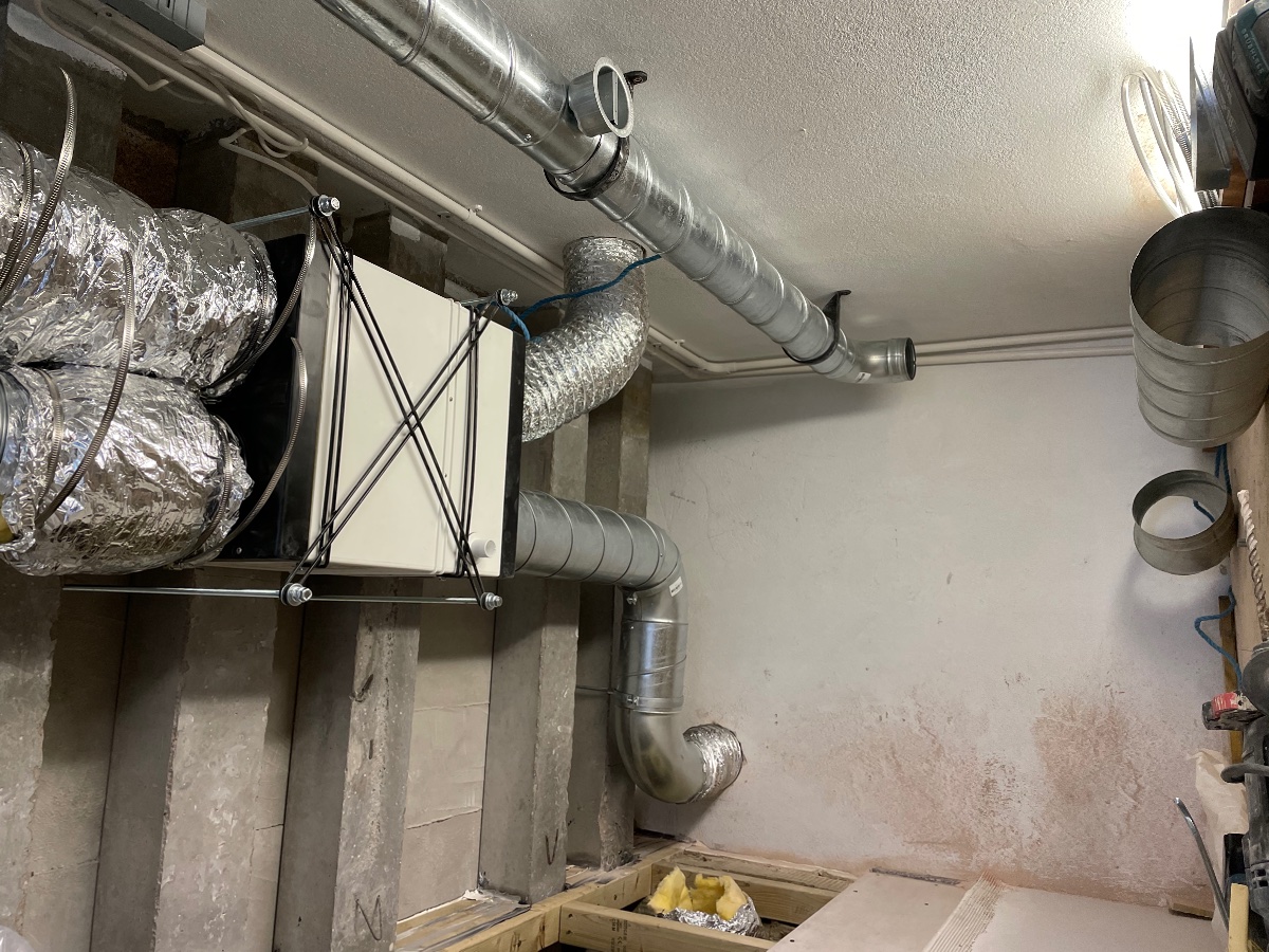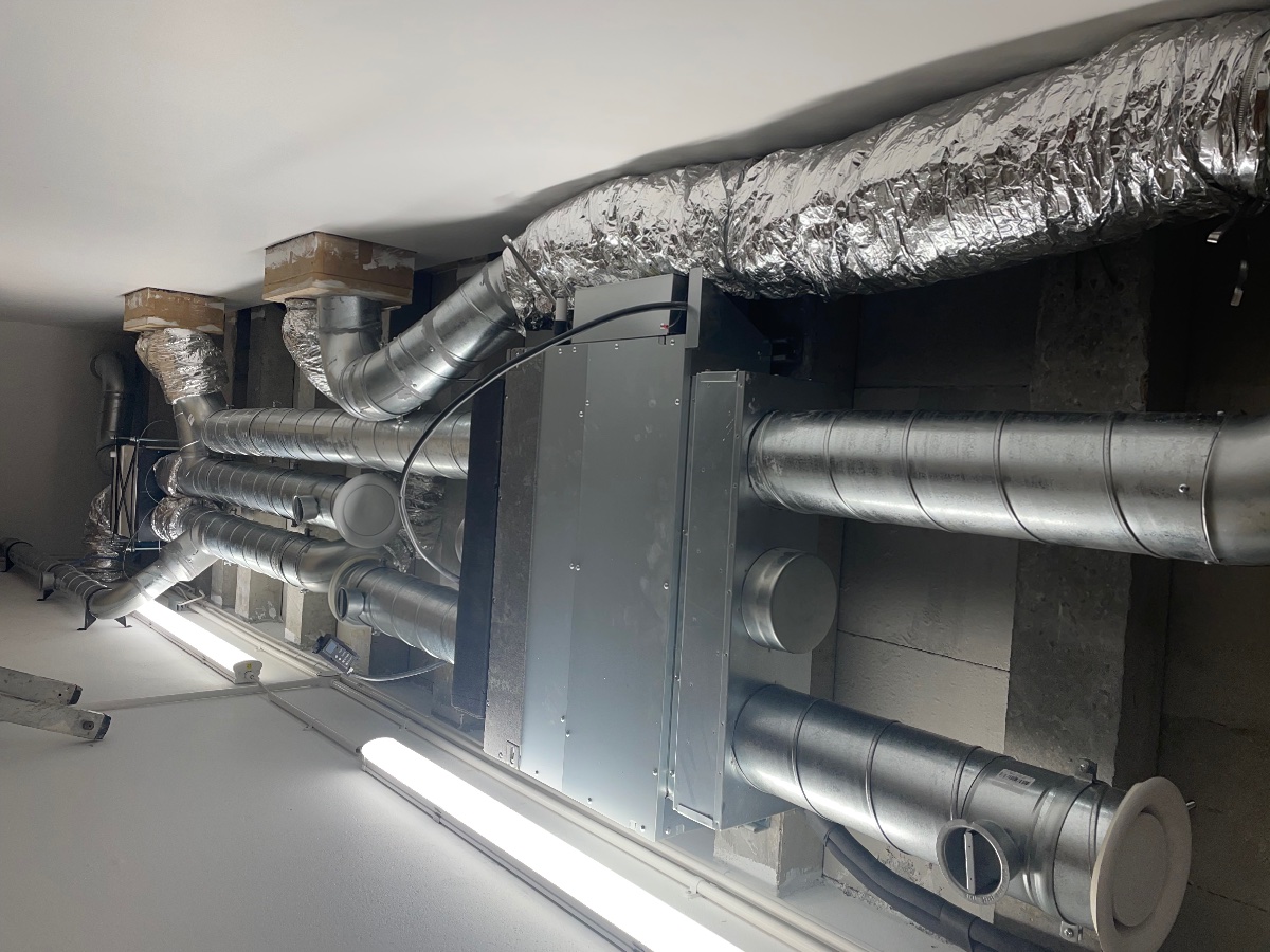 Heat recovery unit installed and all ducted up including cored holes in the outside walls. Flexi duct used at some point on all runs to isolate the vibrations from the fan units.