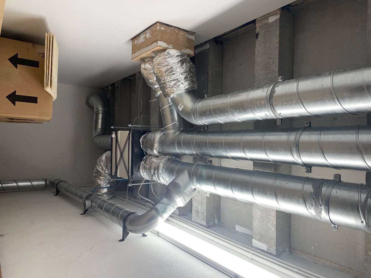 The silencers are in on Sorbothane, all connected up with 8” duct in the ceiling void which then got 300mm minimum of fibreglass loft insulation, this was hideous to do!