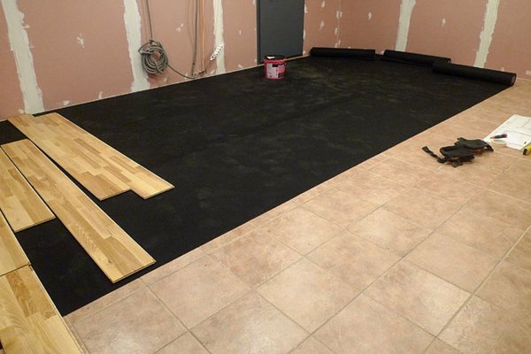 3mm (that's about 1/8th of an inch) of Regupol was glued to the old tiled floor. I studied about whether to glue or loose-lay the Regupol and decided to glue it. Having finished I would say it made laying the wood easier.