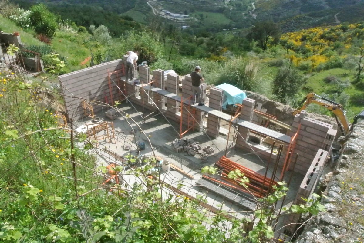 Guys showed up at the normal time and did the bits they needed to for the right corner. Concrete was delayed until 14 (they did not actually come til 15) so they worked more on the walls and window sills. Starting to go up at an angle now. Anyway, sadly, they only got the first 6m3 of cement poured and it looked like the wall was starting to bulge or bend out tiny bit in the middle so Paul made the call to not pour the rest. The risk was too high. We may end up having to pay for the 6m3 of concrete in the 2nd truck if they could not find another job to use it on. Damn.. Anyway, the last cement in the tube they used next to the wall where they will put some of the old ruin stones. Progress but a bit of a set back as on Monday, they will have to take down the front wall panels and supports and start over completely to do it again, so this is a bit of a set back, perhaps 3-4 days of work. Not sure..