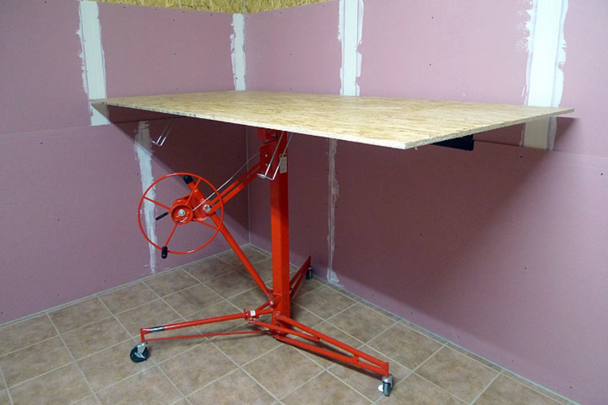Up with the first layer of plasterboard. The lift proved its worth as it held boards flat while they were screwed in place.