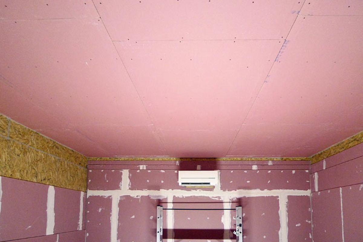 All done, OSB and 3 layers of fire-rated plasterboard, complete with plaster and tape. Backer rod is in place in all corners - ceiling-wall, wall-wall, wall-floor. Caulking will have to wait until next week.
