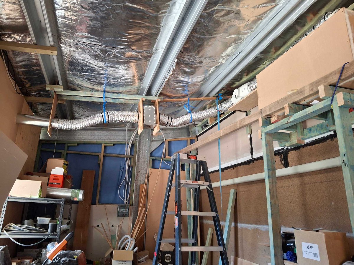 While this issue has been solved, I’ve burned a lot of time solving it and executing those plans, whereas had I designed it that way, I’d have run the C section through to the wall frame before sheeting and avoided the work-arounds on the wall behind the silencer to fit the plenums. Solved – but I reckon it cost me 2 months in extra work time.