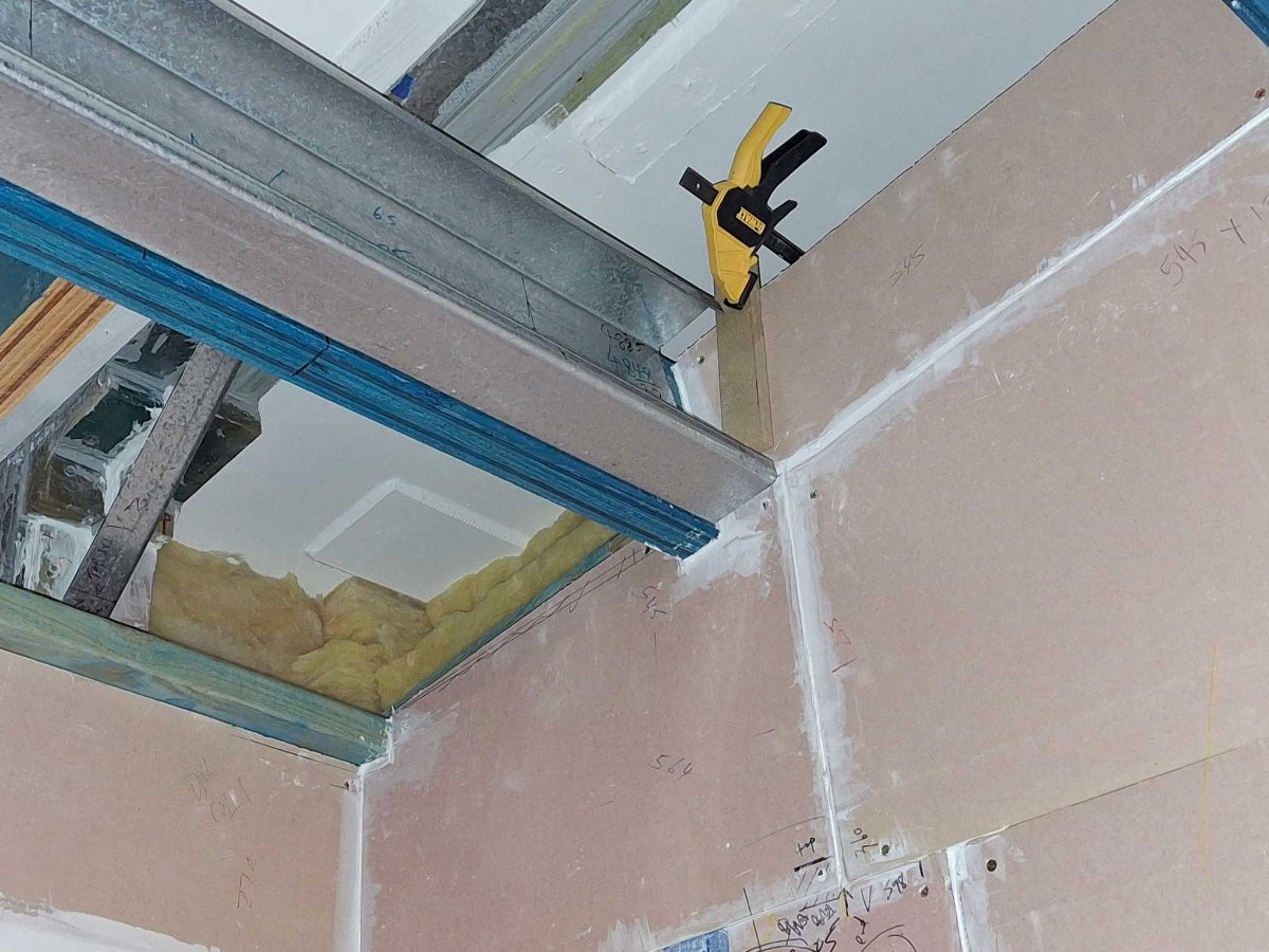 Nothing ground breaking here but I have observed that every “wrinkle” you have – in my case, column boxing and the ceiling rake adds soooo much time relative to straightforward drywall (gyprock) wall hanging and sealing.