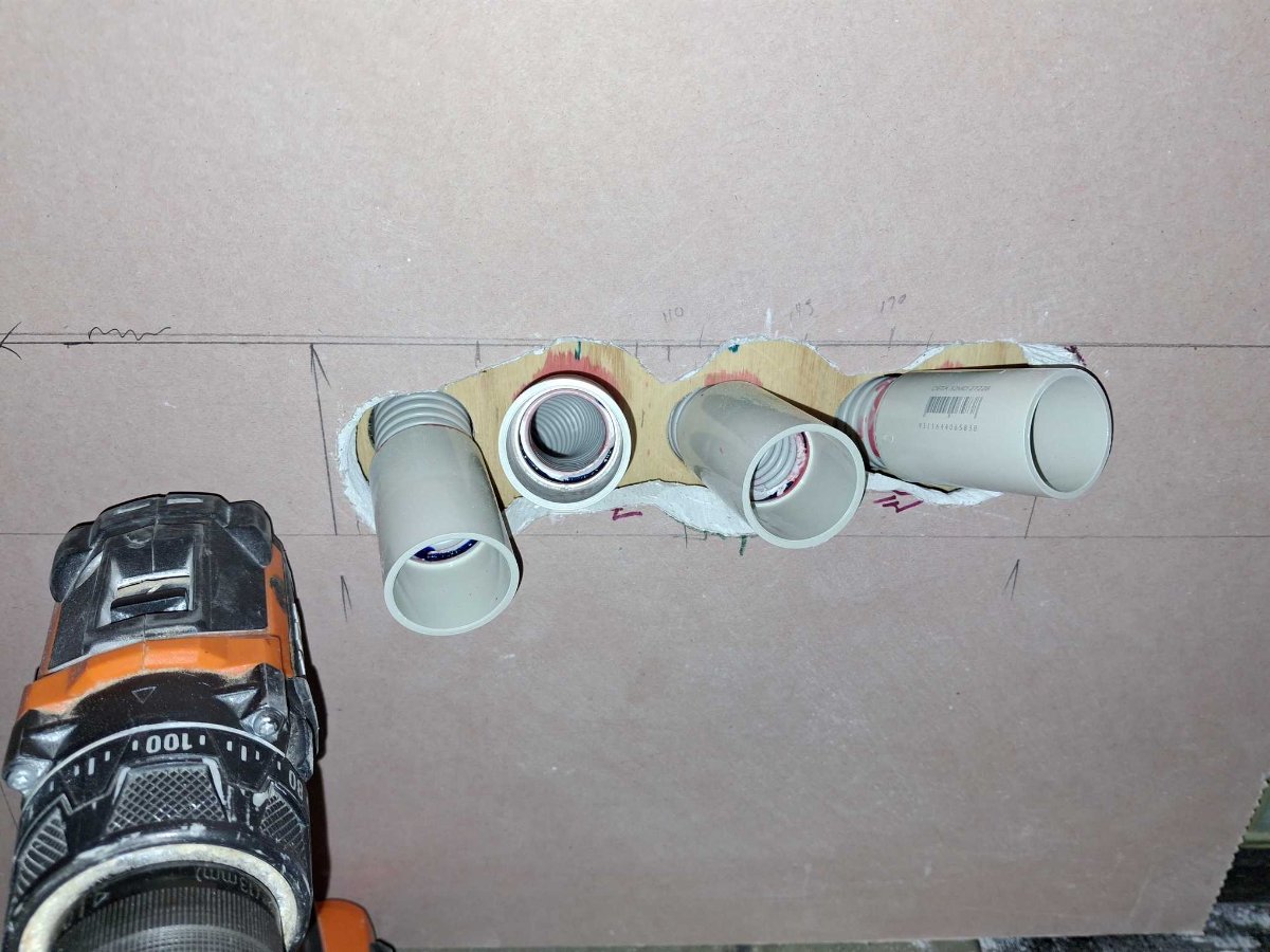 I also worked out how I’d run the audio and related cabling between the rooms. I have run the conduits and am now sealing the 2nd layer penetrations. I’m using “Big Stretch” on these again. There is probably a smarter way to do it but that's what I did :D