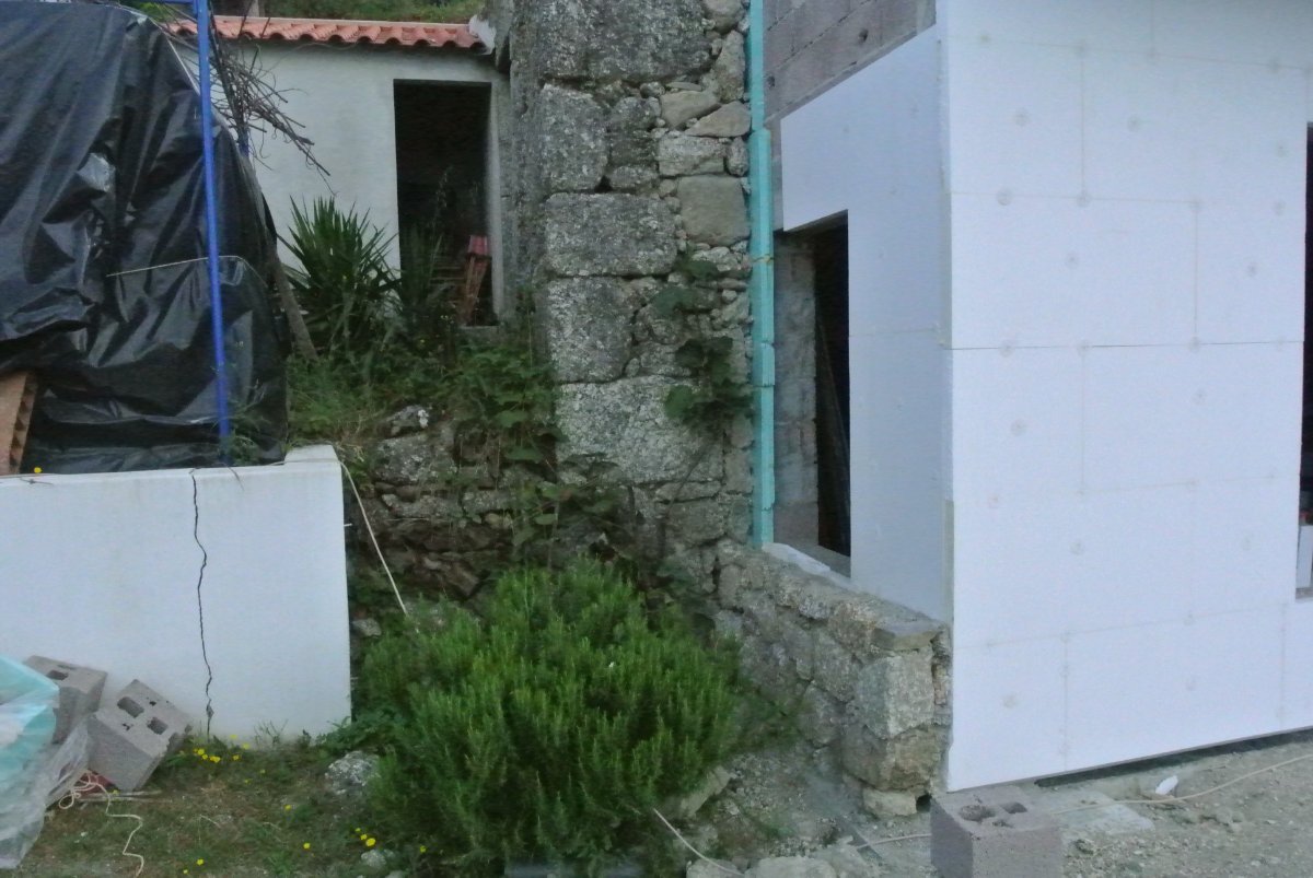 The guys worked to rebuild the ruin wall on the side of the building closest to the house. It will go in several steps down. In the gaps about the stones they will make the caputo system of insulation and water protection