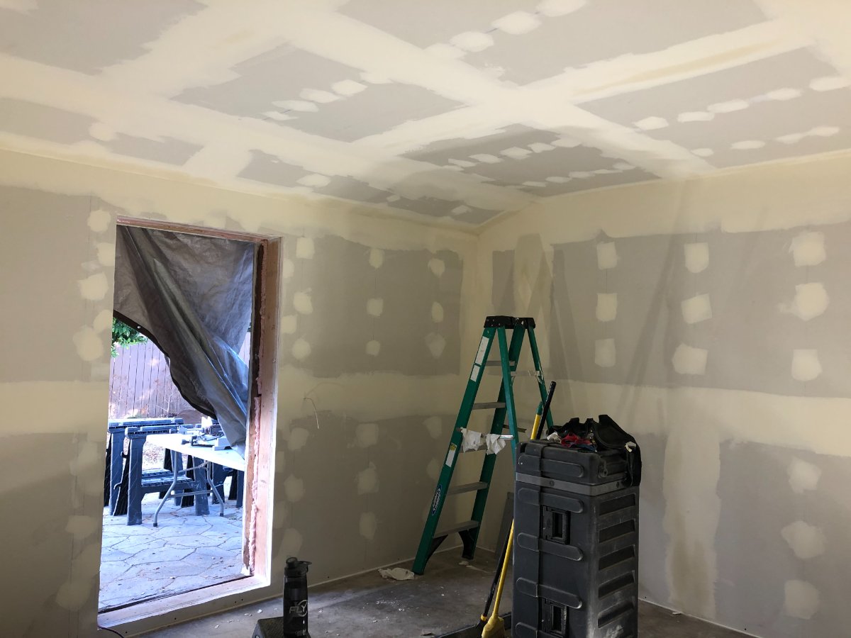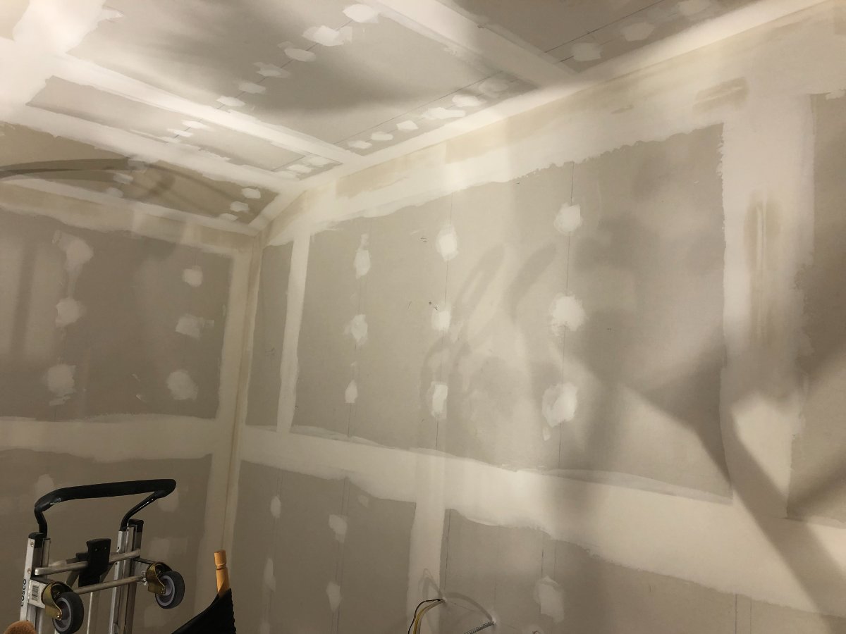 Next up was tape and mud. I have never taped and mudded an entire room before, I've only patched holes, so I was very hesitant to do this myself. I had 3 different contractors come give me a quote to do the room, and the prices ranged between $600 - $1200. As I'm already over budget, I decided to tackle it myself, and for less than $100 in materials, I went at it. I watched a series of videos by a guy on youtube (who has hundreds of videos and really shows the details for these types of things), and it really helped. It took me about a week to get all 3 coats on, so while it took me a lot longer than a pro would have taken, I was EXTREMELY happy with the results.