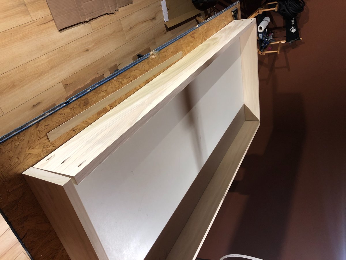 It looks clean, and now the rough frame is ready for a door jamb. I went to my local lumber yard and bought 6/4" poplar. I measured 4 times, and cut the frame to size. I used pocket holes to construct the jamb around the door. I ripped 1/8" and 1/16" spacers so that the door jamb would be EXACTLY the correct size for the door.