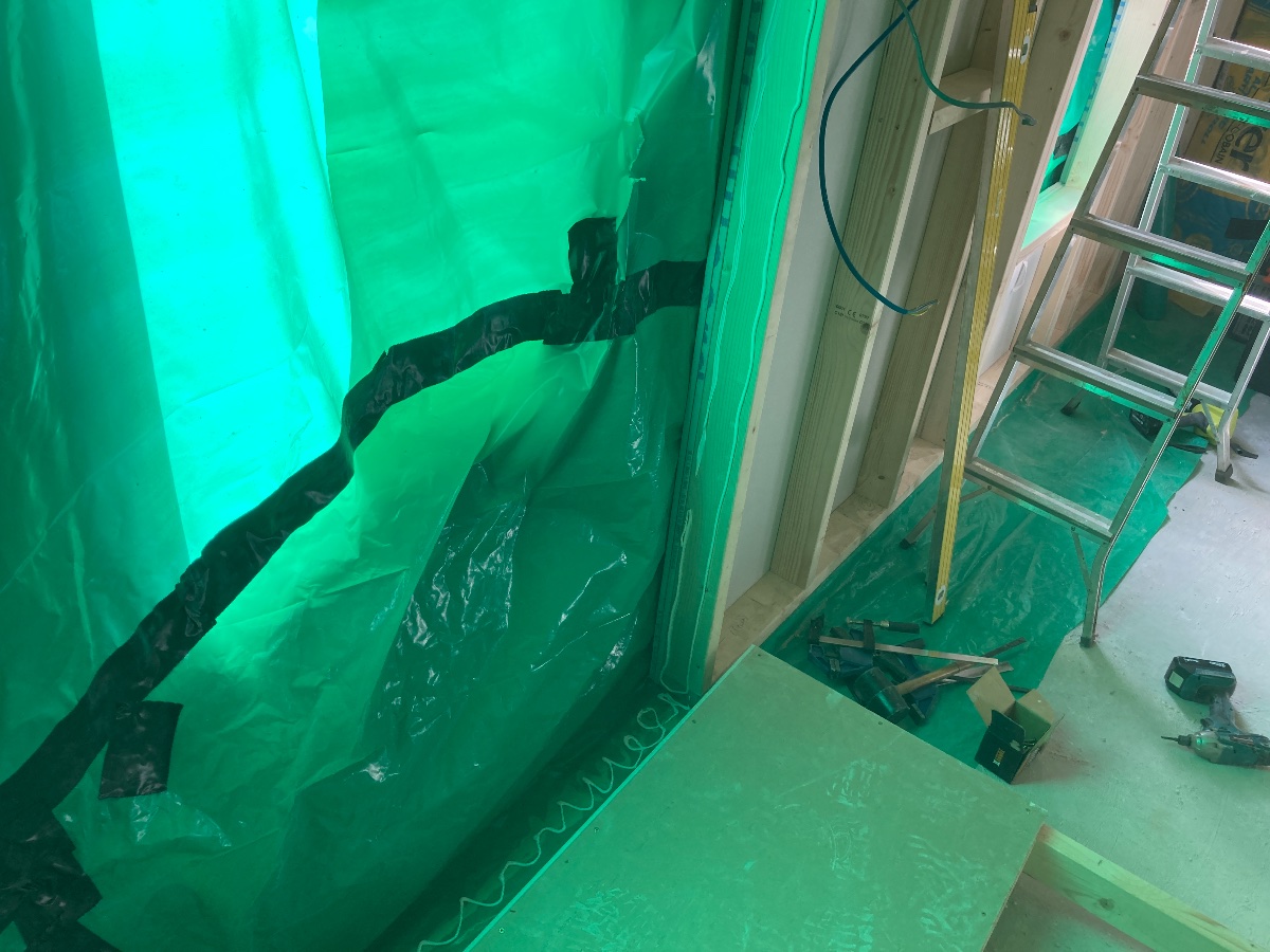Vapour barrier on top of insulation, taped to vapour barrier from behind plasterboard: