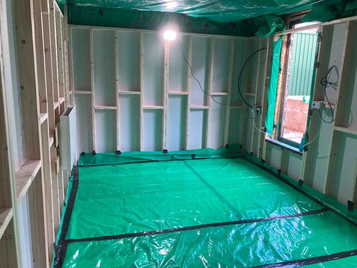 On Monday I cut and made the stud wall frames for the inner walls, in 10 sections that would be liftable. Tuesday I finished these and added plasterboard to the three frames for the back wall, ready to lift with my brother in law who joined me on Wednesday. We managed to finish and lift 6 out of 10 sections before he had to go for the school run, so on Thursday I managed to finish the remaining 4 with assistance from my partner Michelle. Each wall section is 4x2 stud, then two layers of 15mm plasterboard with the gaps overlapped. Where wall sections meet I overlapped the second layer of plasterboard by 20mm, and as each section went up copious sealant was applied to all the bits it touched!
