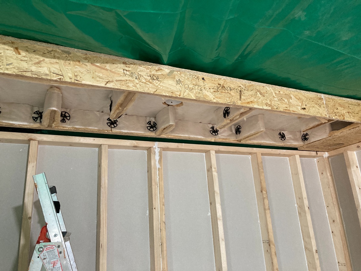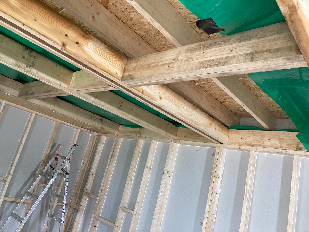 I had to do that with the stud framework otherwise it would not have stood up on its own. It was only after the insulation and a layer of OSB went up that we could connect the 4 walls to each other and remove the temporary ties. When the ceiling went up it provided the extra dimension of stability. It is a concerning point in the progress but having walked that path I can reassure you that it will work out alright but it is important to remove the temporary ties to avoid flanking paths.garethmetcalf wrote:Source of the post... the walls (which I’ll temporarily be attaching to the exterior ceiling joists until the inside room joists are fitted).