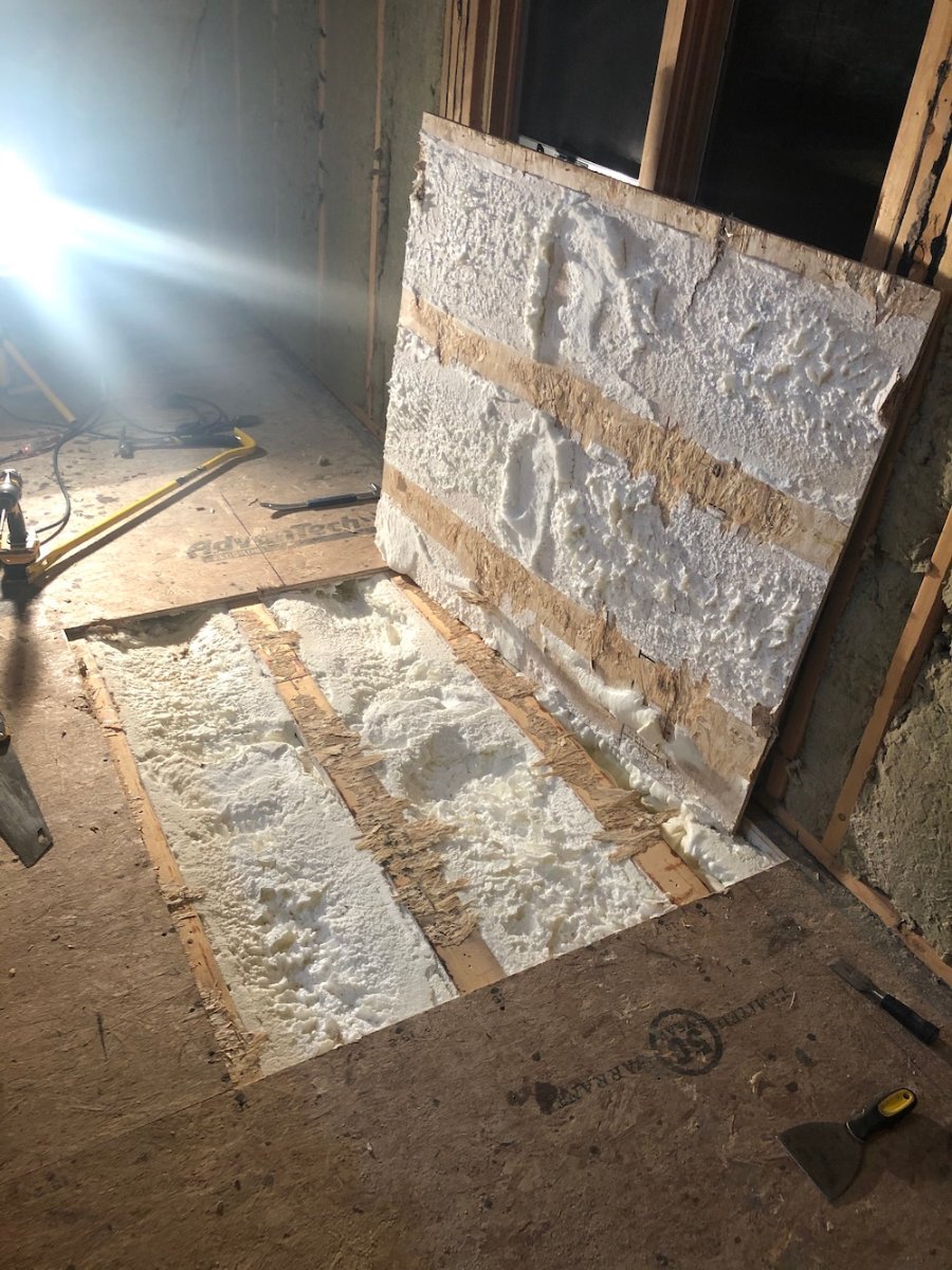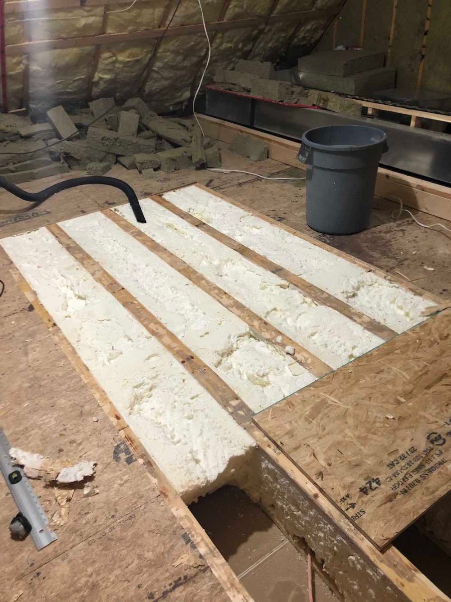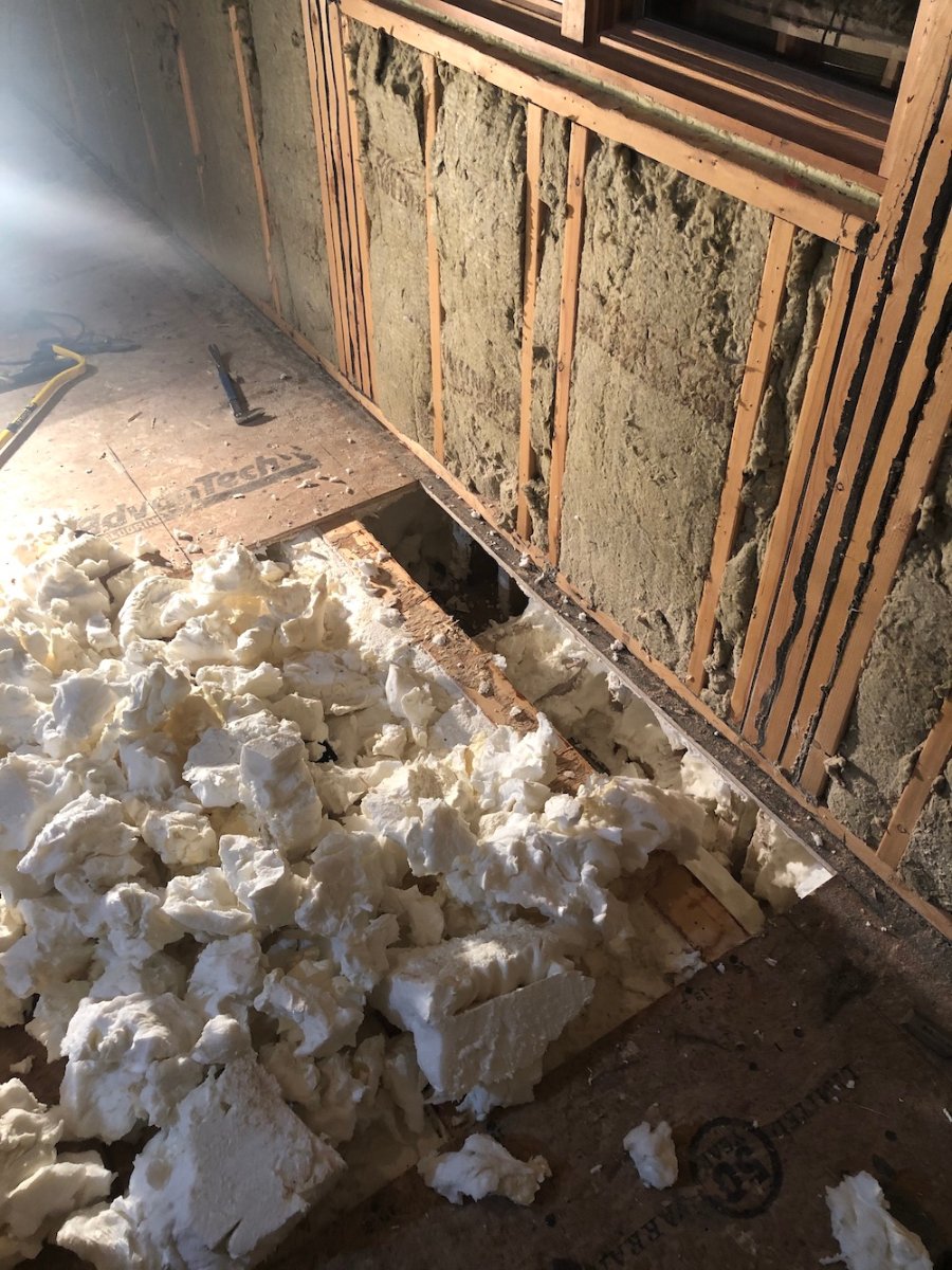 Here's the 2nd section of the floor where I had to rip out the existing sub-floor. I tell ya, must have filled around 35-40 garbage bags of spray foam insulation for the two sections combined. Doing this section was very similar to the first section so since I learned a few tricks from the previous section I was able to save a bit of time doing this one. Only difference this time is that I had to open it up a little wider to span across 3 floor joists versus 2 for the previous section. This section of the floor will support two separate inner leaf walls. 1 for the Control Room and the other for the Live Room. They will be approx. 14 inches apart.