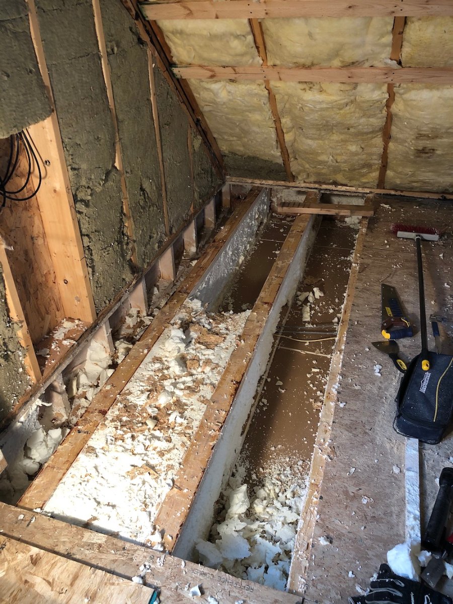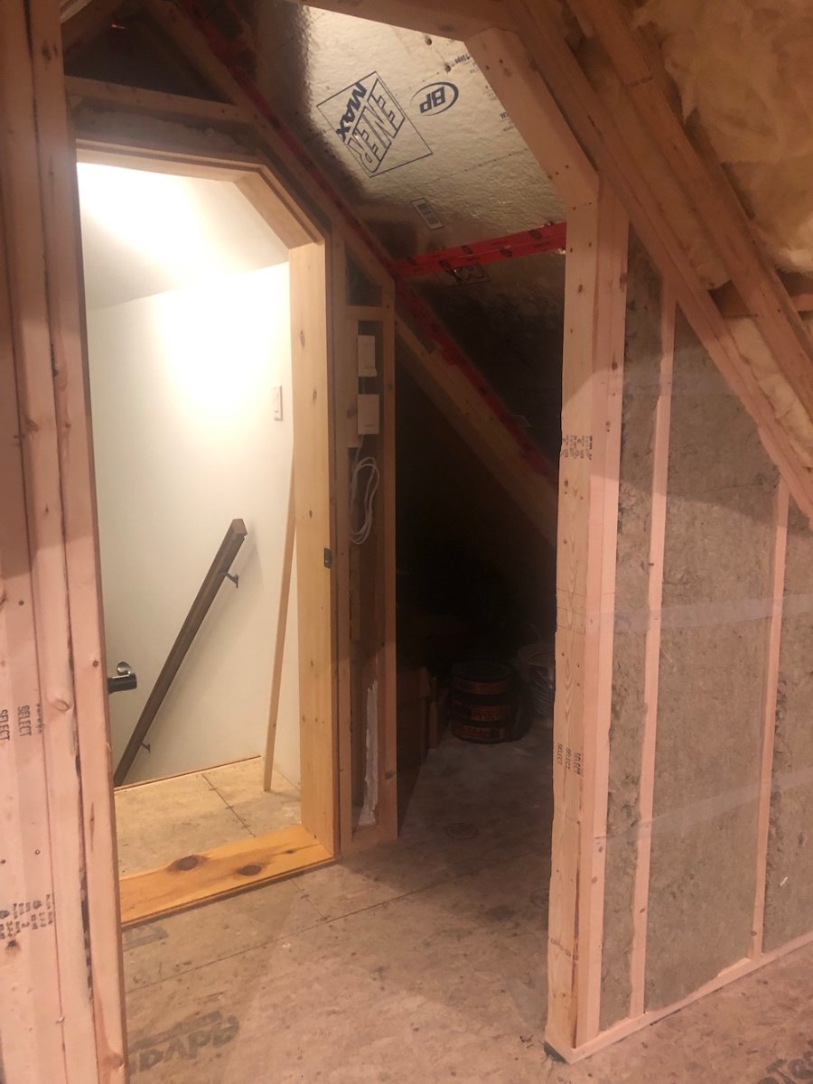 The new build required me to undo basically everything I had previously done. You can see the pictures I've included where I've taken down all the wall framing and I've started taking off all the 1x3 strapping, the Enermax panels used as my vapour barrier and the other 1x3 strapping under it. I'm literally stripping the entire room with the exception of the yellow fiberglass insulation. I will be reusing all of the Enermax in the basement when we decide to finish it.